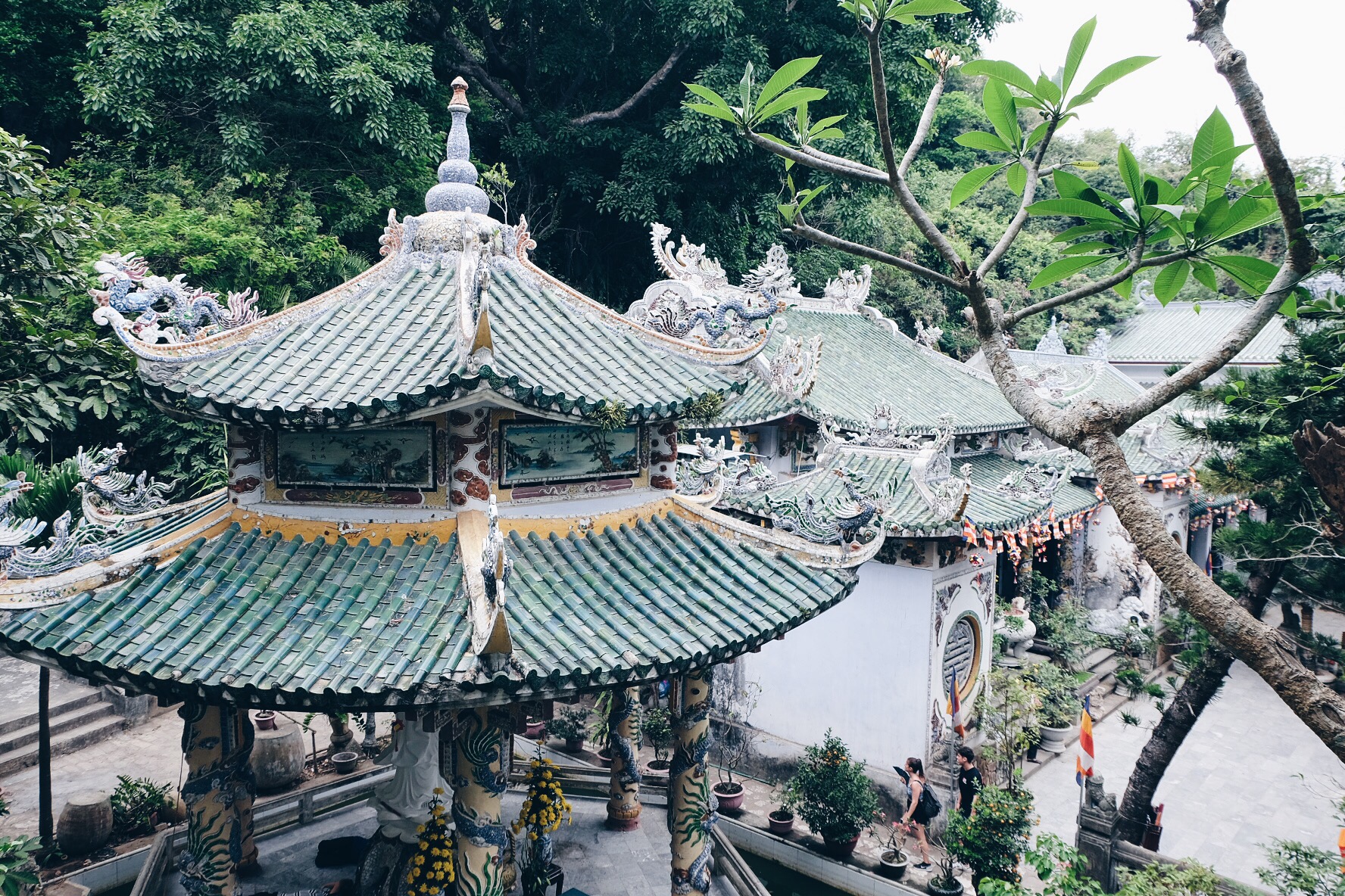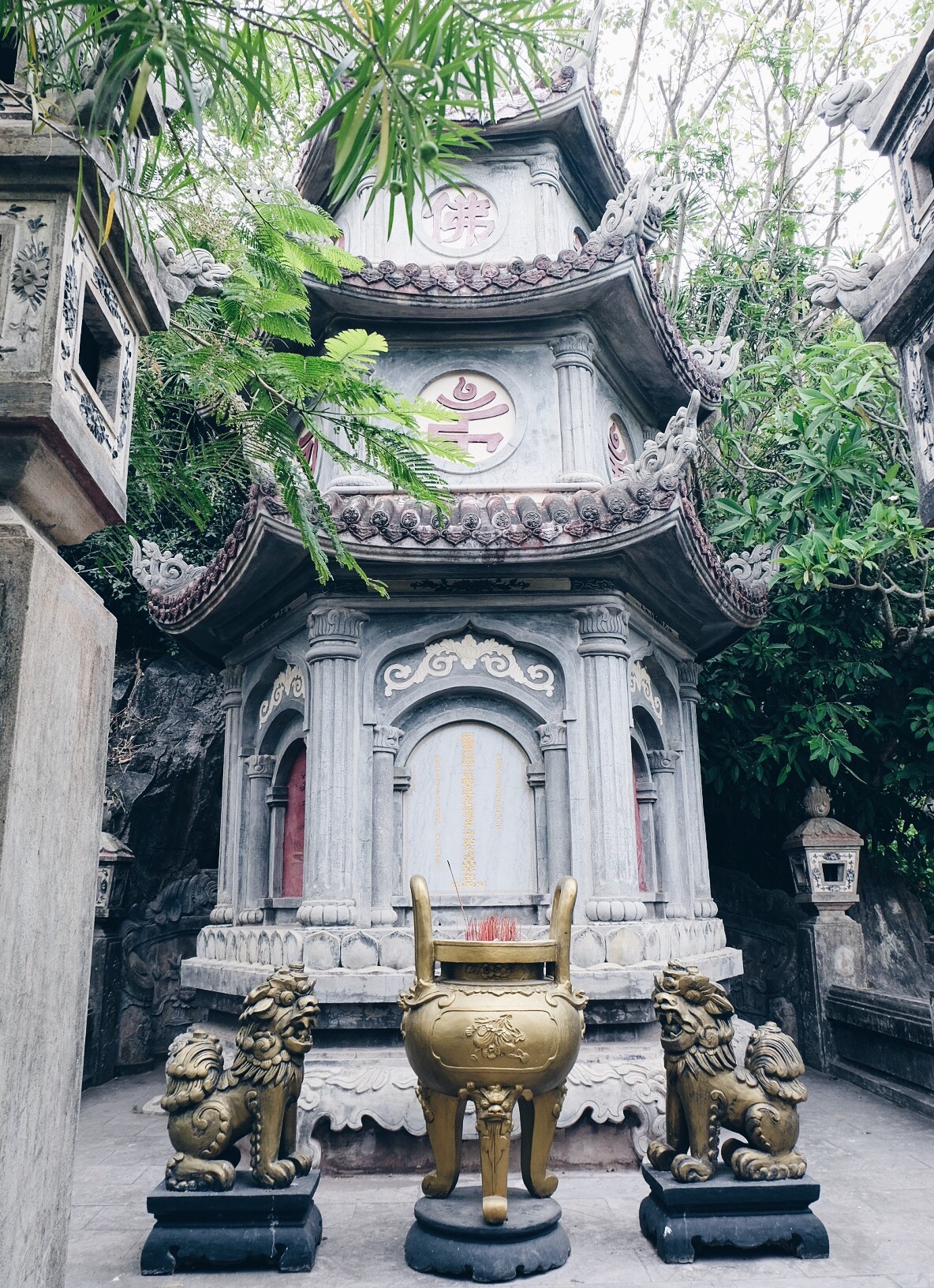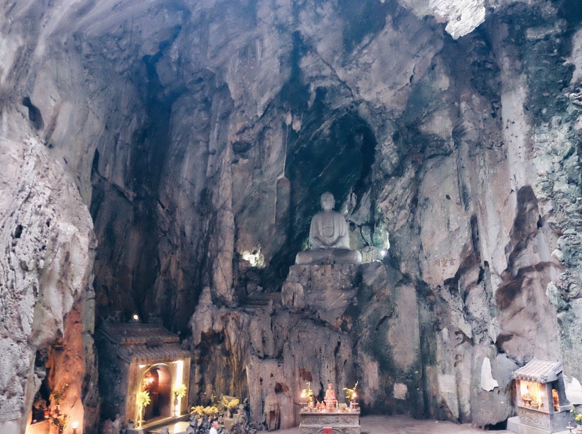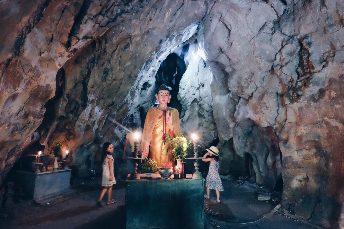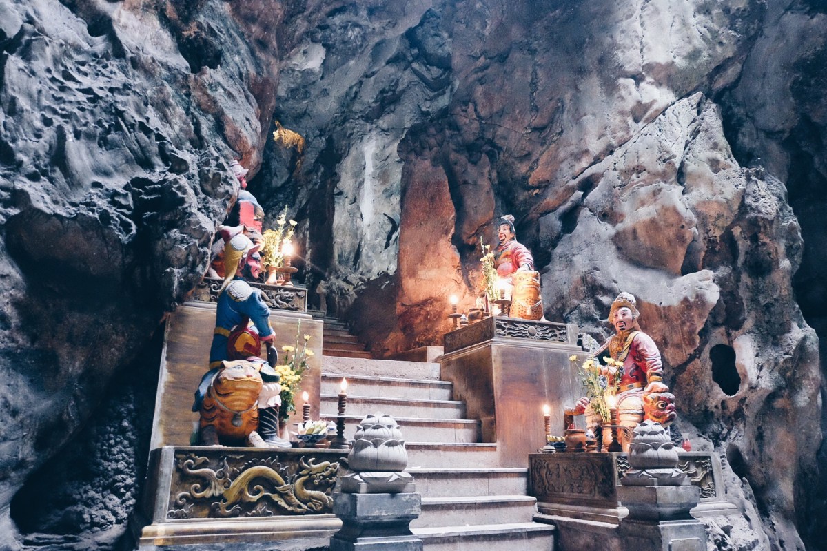 The five ‘mountains’ are named after the five elements; Kim (metal), Thuy (water), Moc (wood), Hoa (fire) and Tho (earth). In the mountains are several Buddhist and Hindu sanctuaries inside caves and tunnels featuring statuary and relief depictions of religious scenes carved out of the marble.