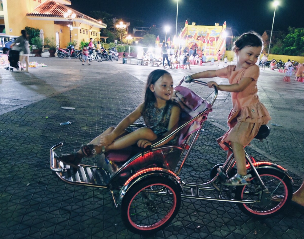 A small tip for traveling families we wish to share: to the left of the Ancient Town is a small area where there are a couple of small carousels, a bouncy castle, a creative workshop and mini cyclos. The fees for the rides and workshop are very small, because only locals use it (5-20.000vd = 1,5-6dkk). We don’t know why no other tourists with kids where here, but the girls had so much fun here.