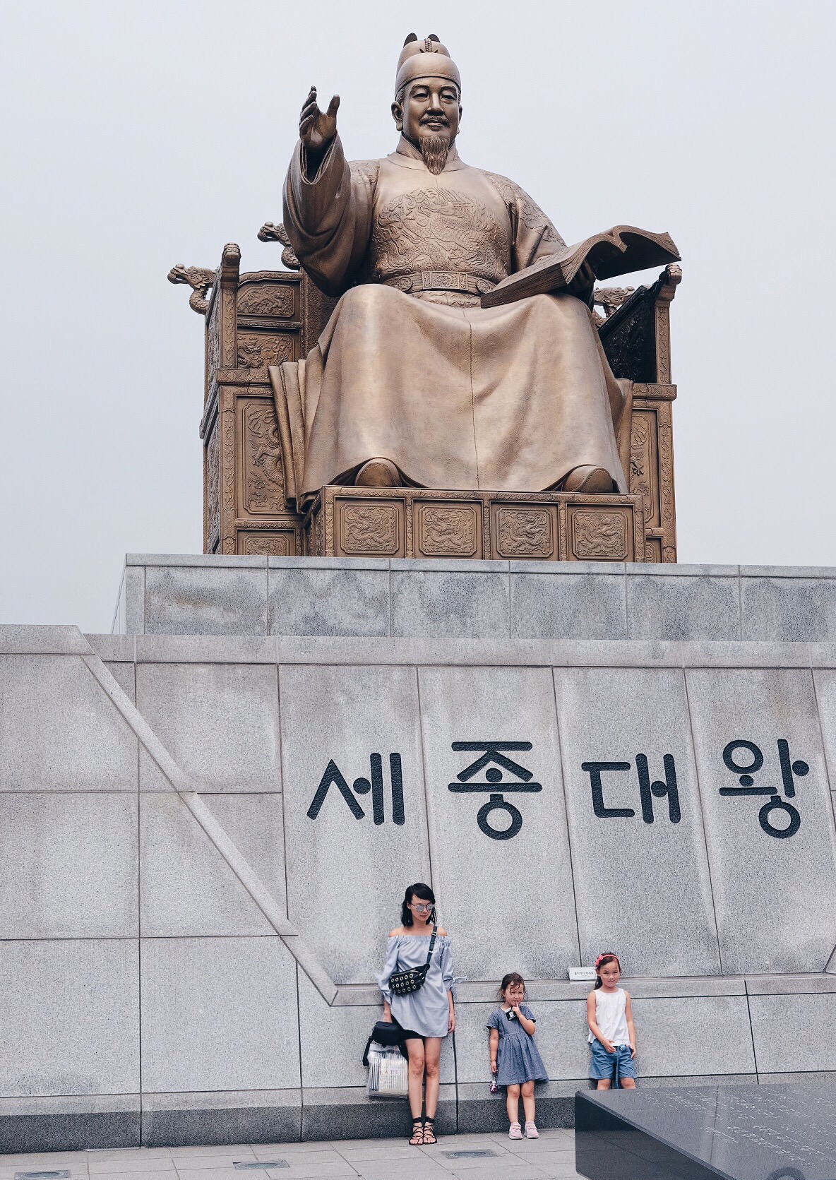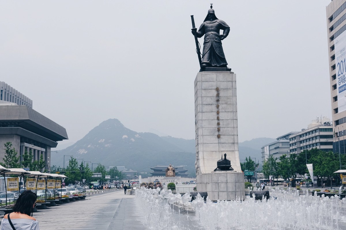 The Gwanghwamun Square in Seoul, is a very picturesque place to visit in Seoul. The main highlights of the square are the two Statues, one is of King Sejong the Great (the gold statue) while the other is of Admiral Yi Sun-Sin (the black statue) “backed up” by the Gyeongbokgung Palace at the end of the square.
