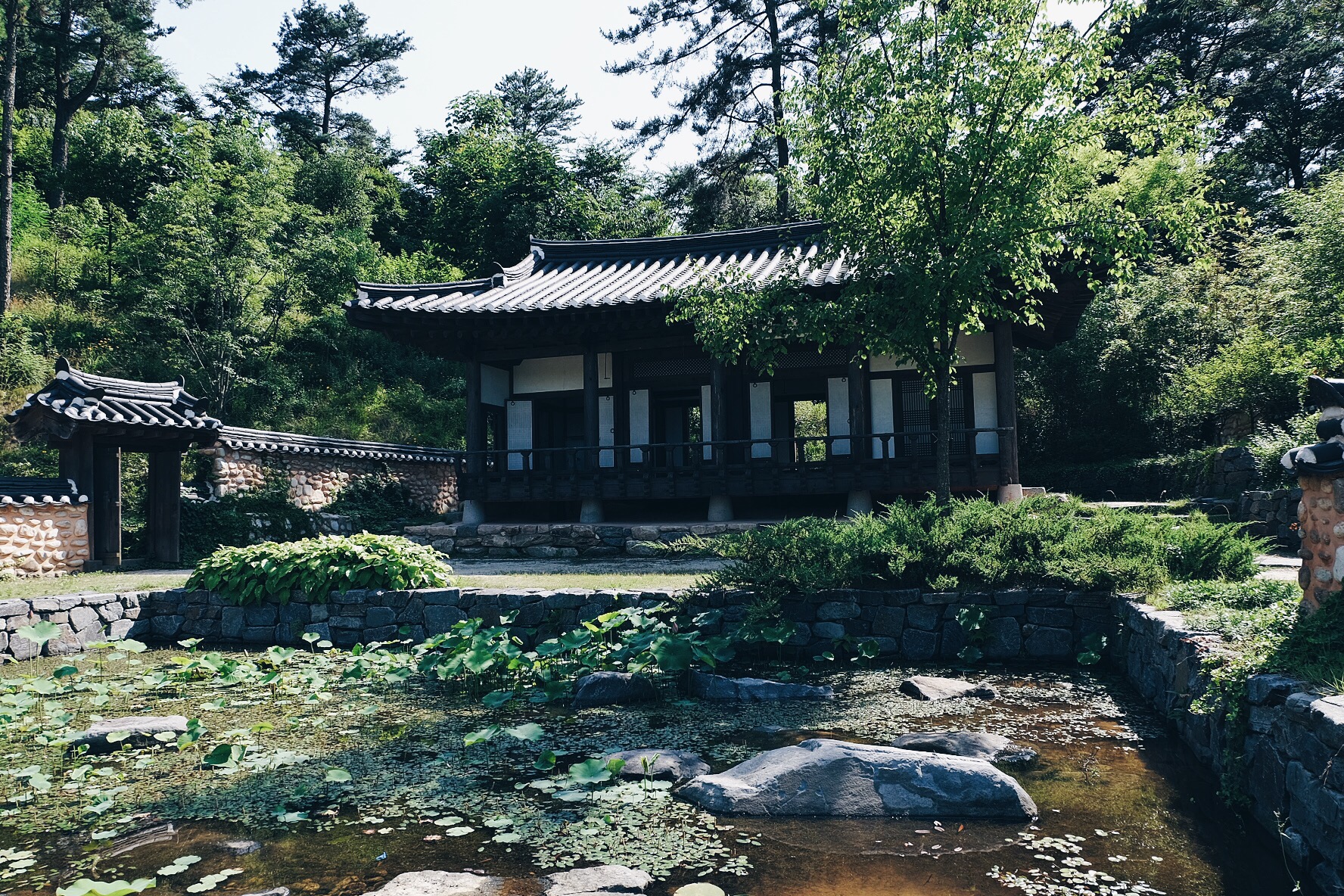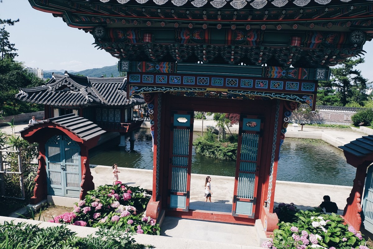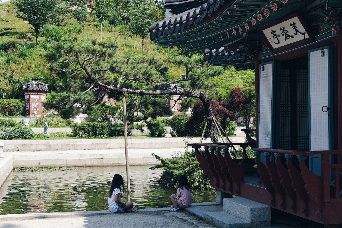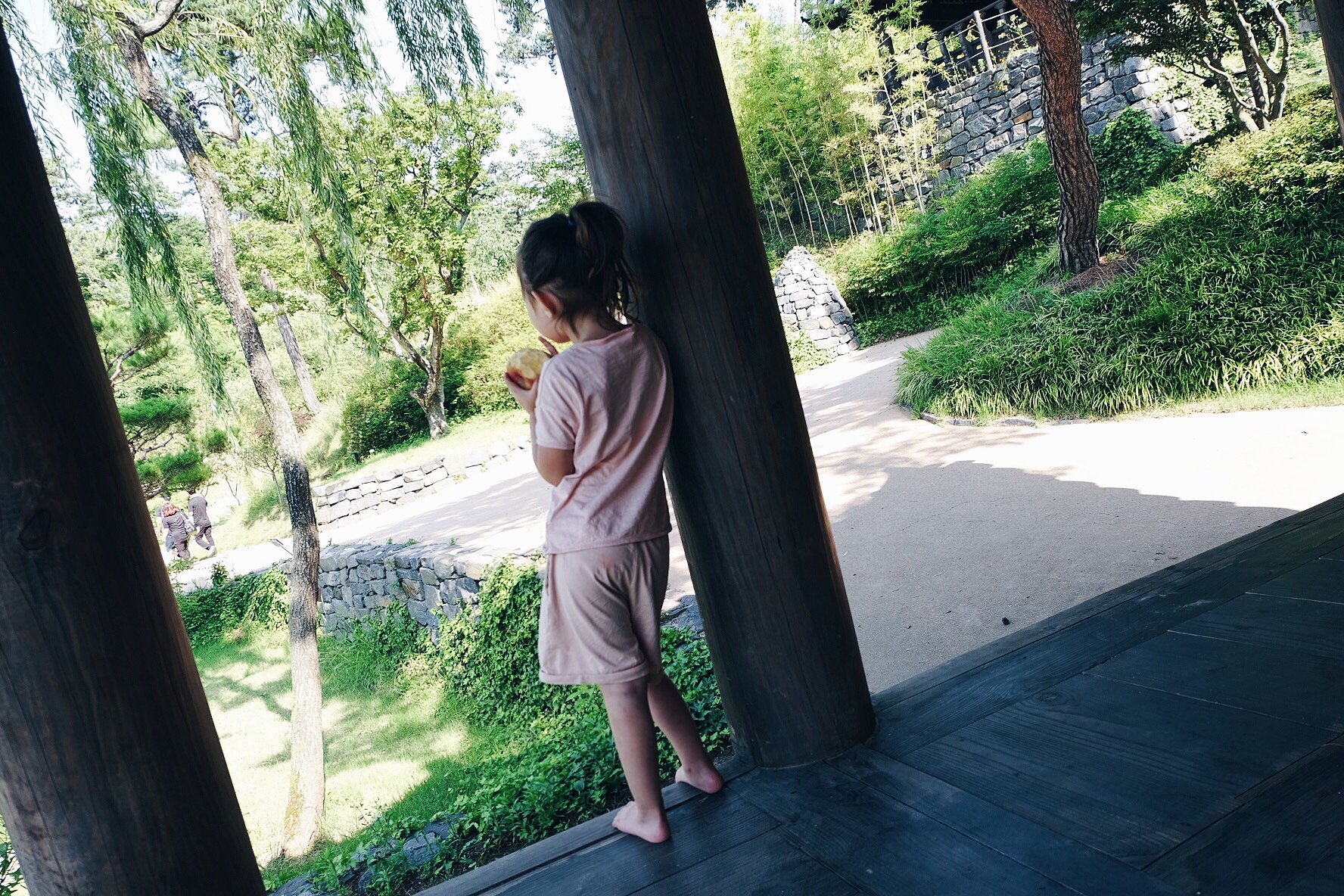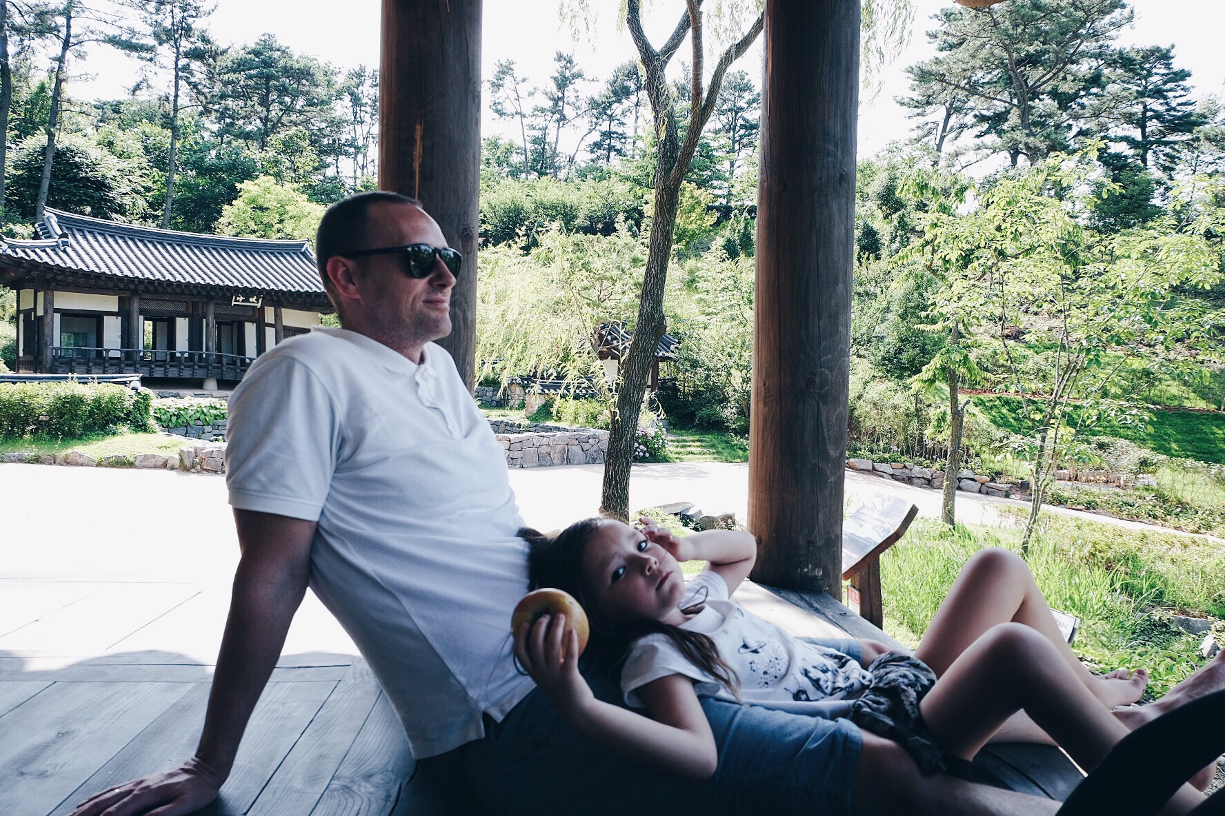 We chilled at the Korean traditional Garden feeding the fish in the pond and having apples in the shadow.