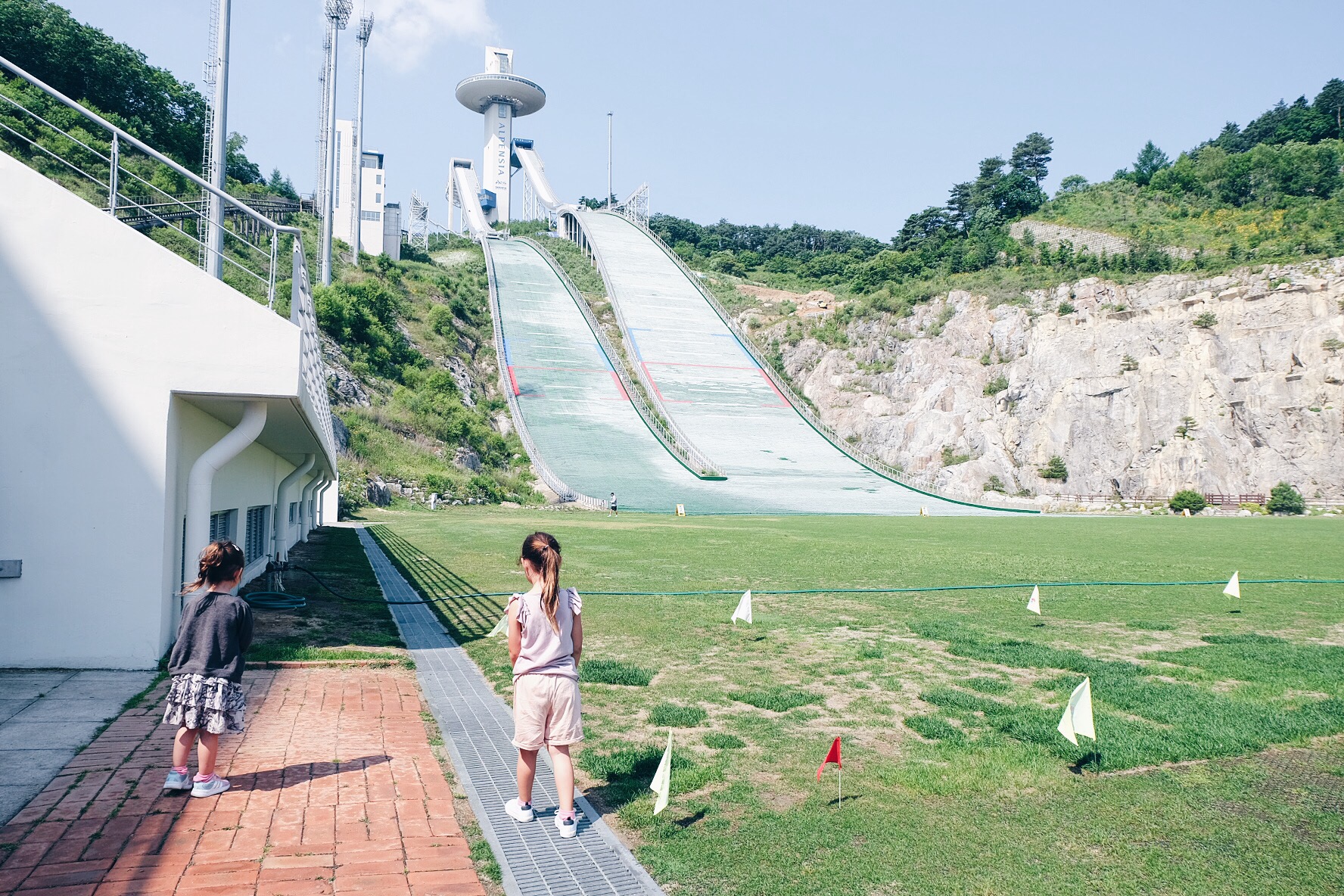When we visited, we were very lucky to actual experience a ski jumping in action. No snow in sight (with a temperature of 30 degrees today), however ski pratising goes on every day anyway.