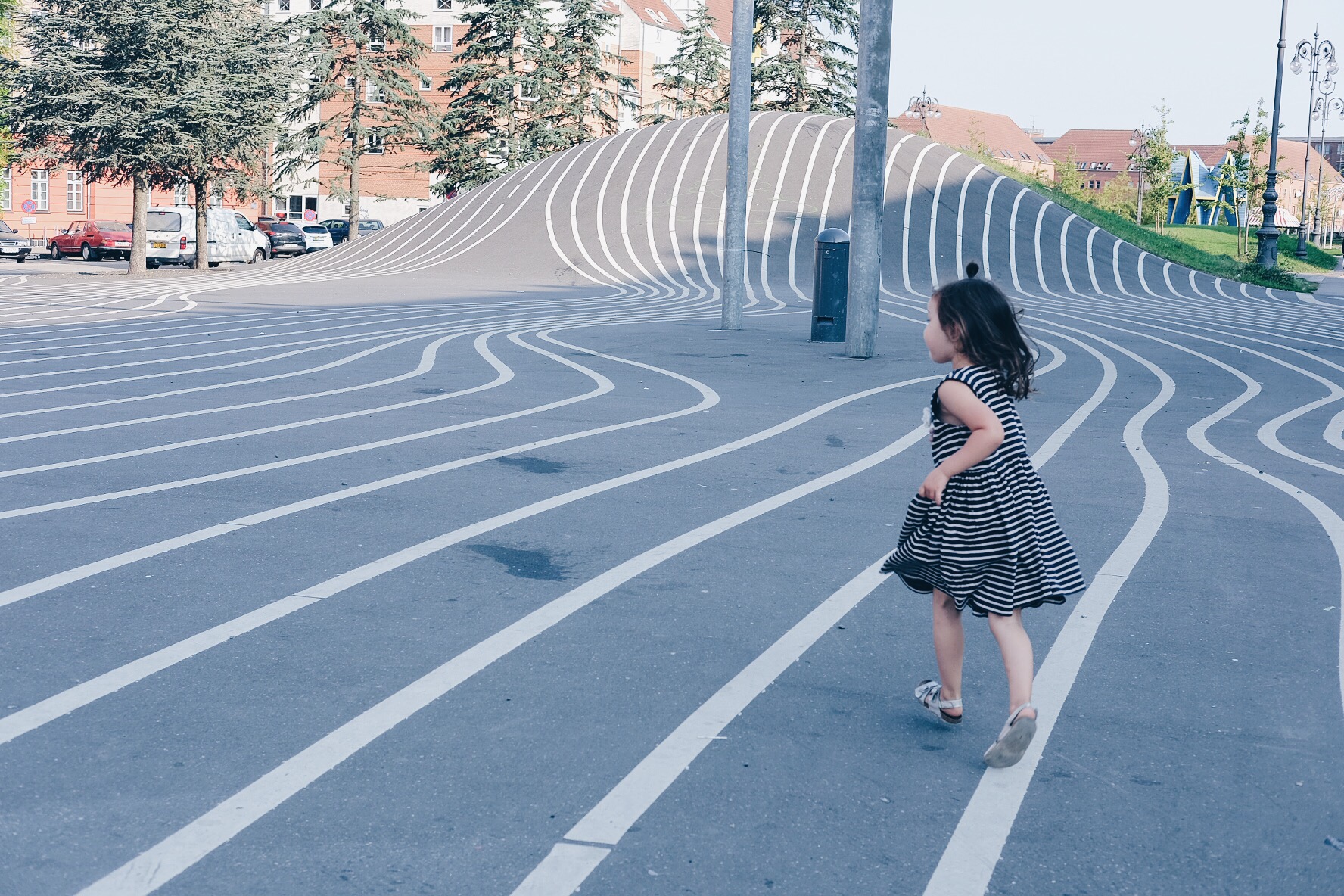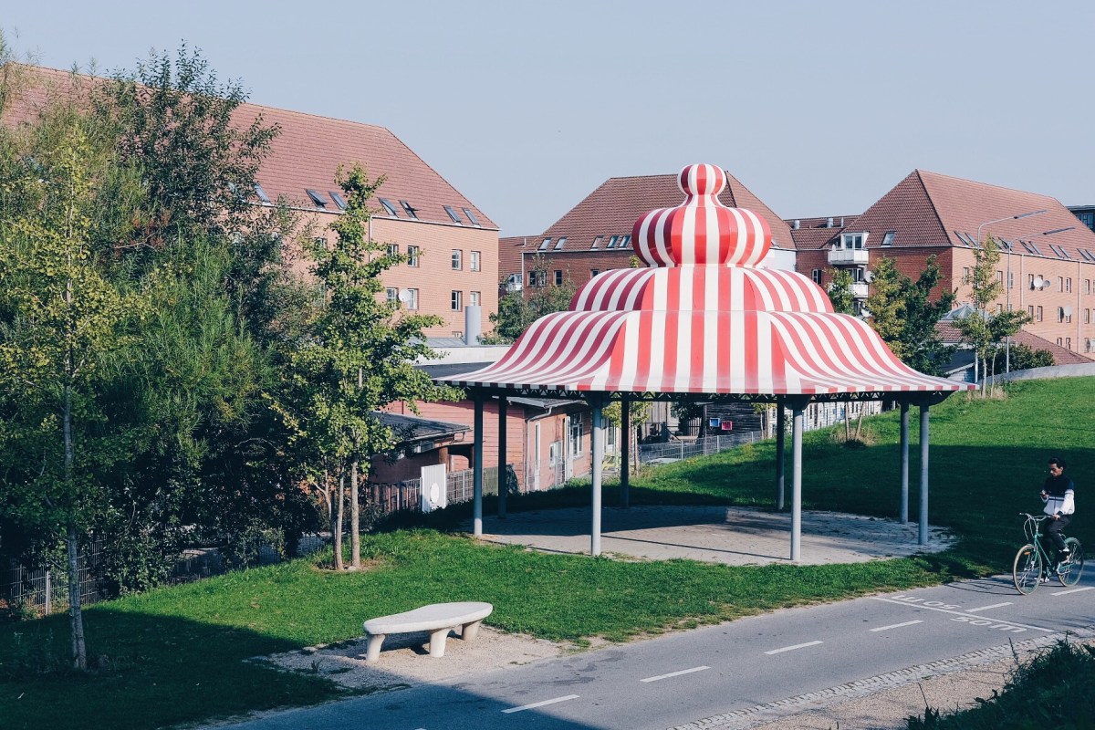 Superkilen a public urban park area that stretches 750 meters through the part of Copenhagen called Nørrebro. It was designed by Superflex and architects B.I.G. Its design is meant to reflecting the ethnic diversity of this part of the city (50 different ethnic groups live together here).