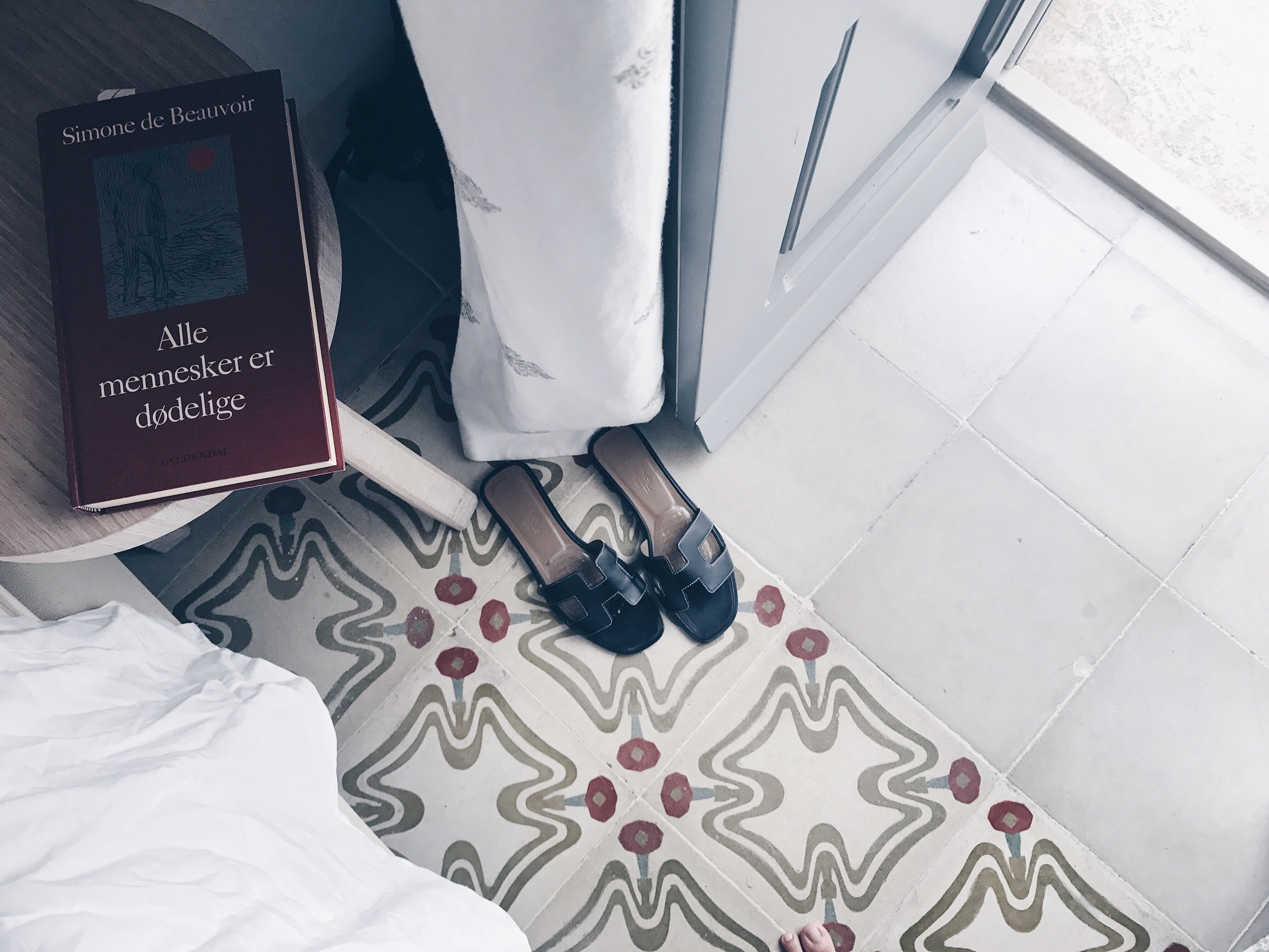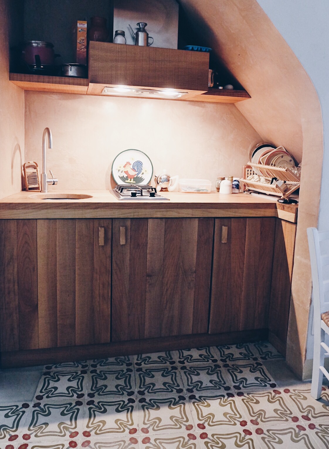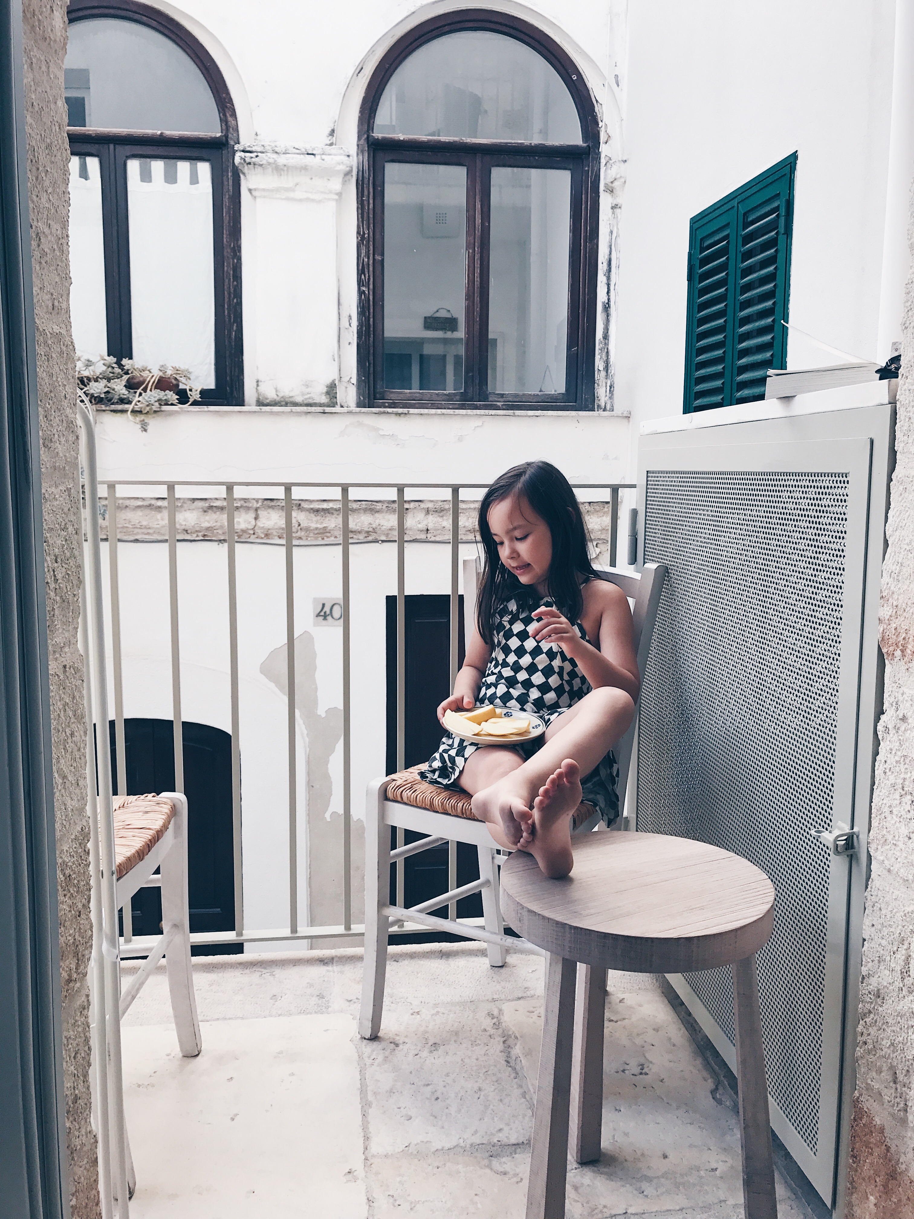 We are staying at the Antico Mondo B&B in the old town of Polignano a Mare. Our little room is in an annex building and has a kitchenette and a balcony. It is on the small side for a family of four, however the bathroom is a nice size and we also use the outdoor space in front of our pastel blue door. We have an extra bed for Agnes and Dagmar is sleeping in the bed with Bjørn and I. Our room is on the ground floor just under the pink flower “roof”.