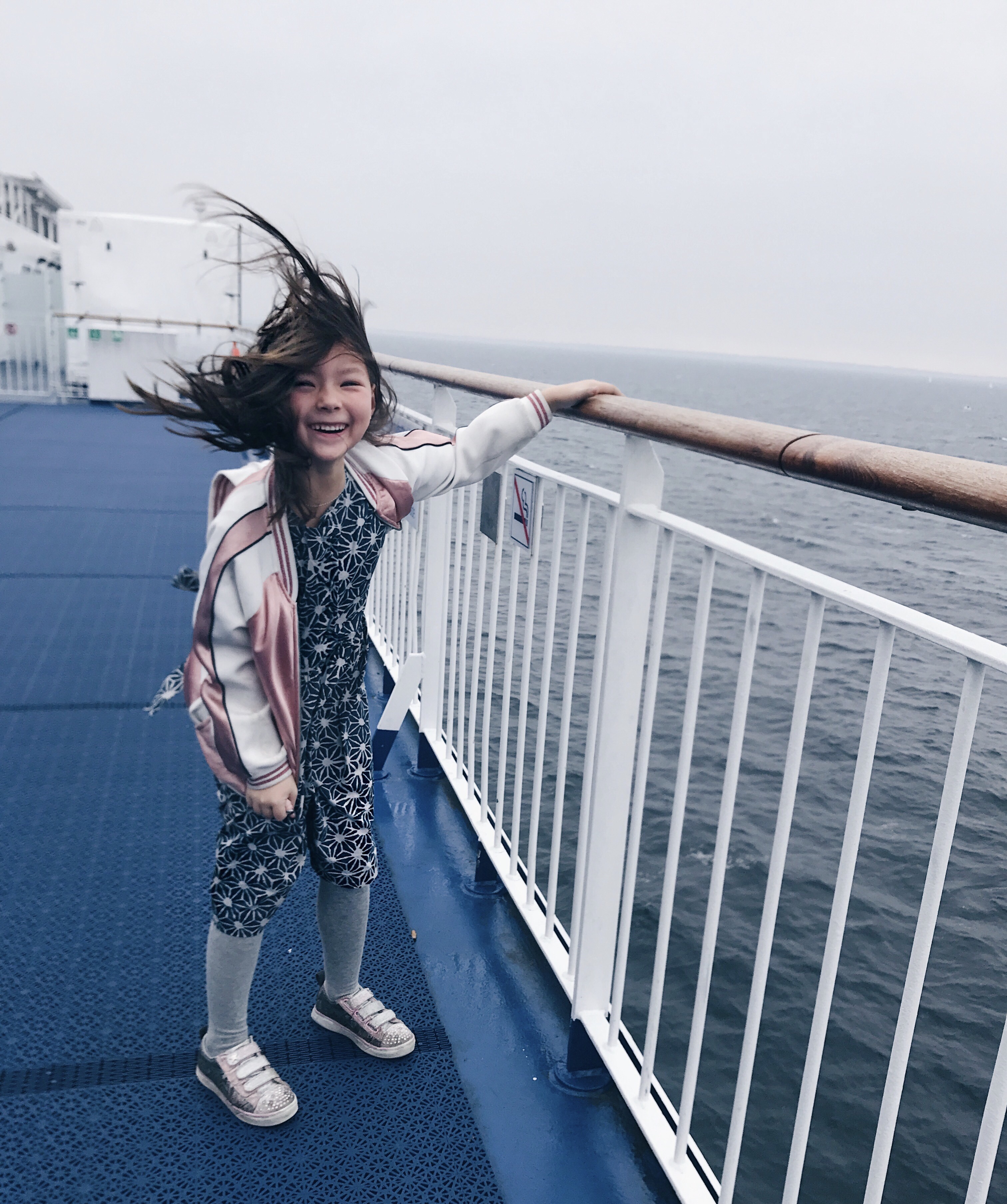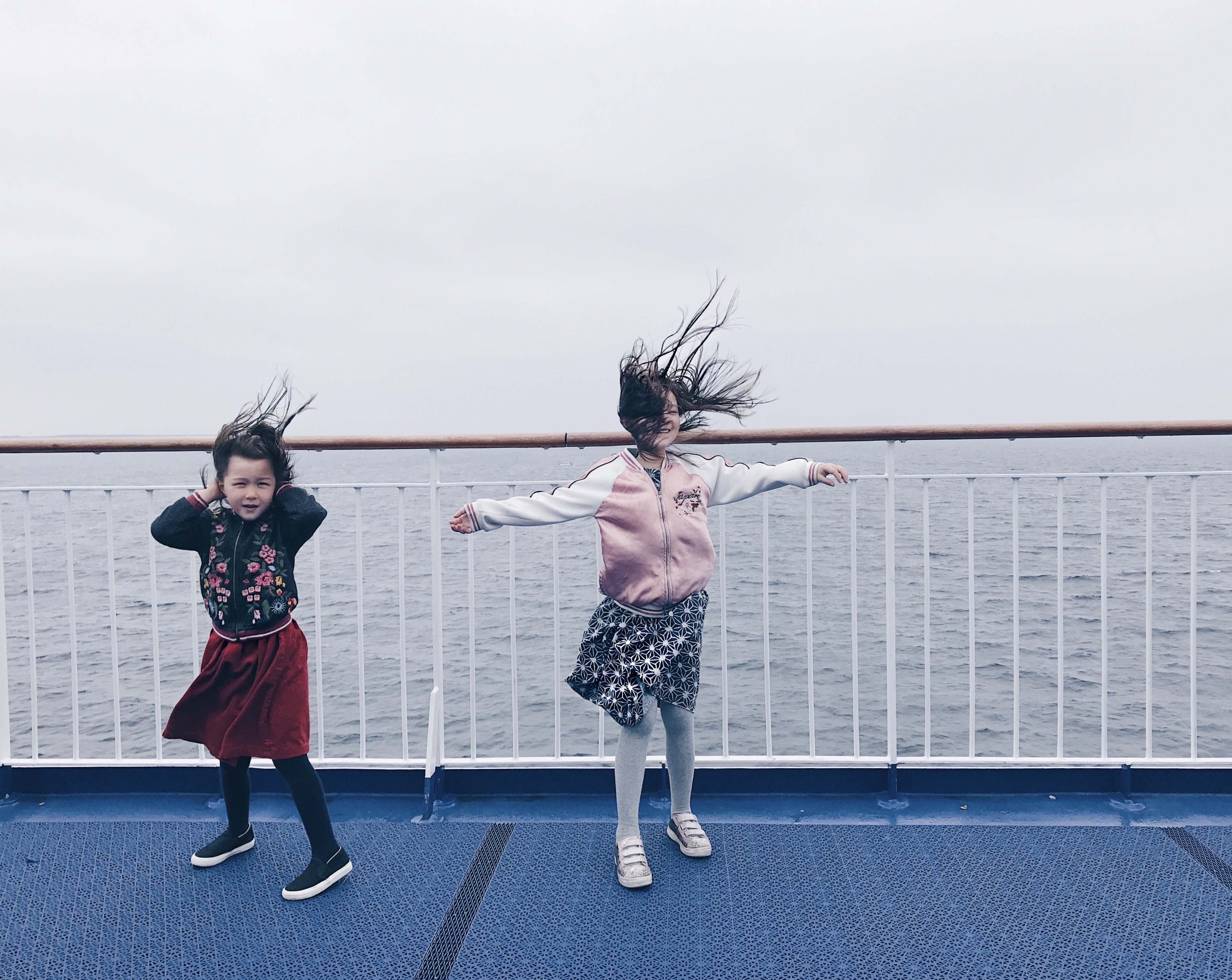 The girls wanted to go outside and see our arrival, however was met by a lot of wind. The last 20 minutes of our time on the ferry was spend playing with the wind.