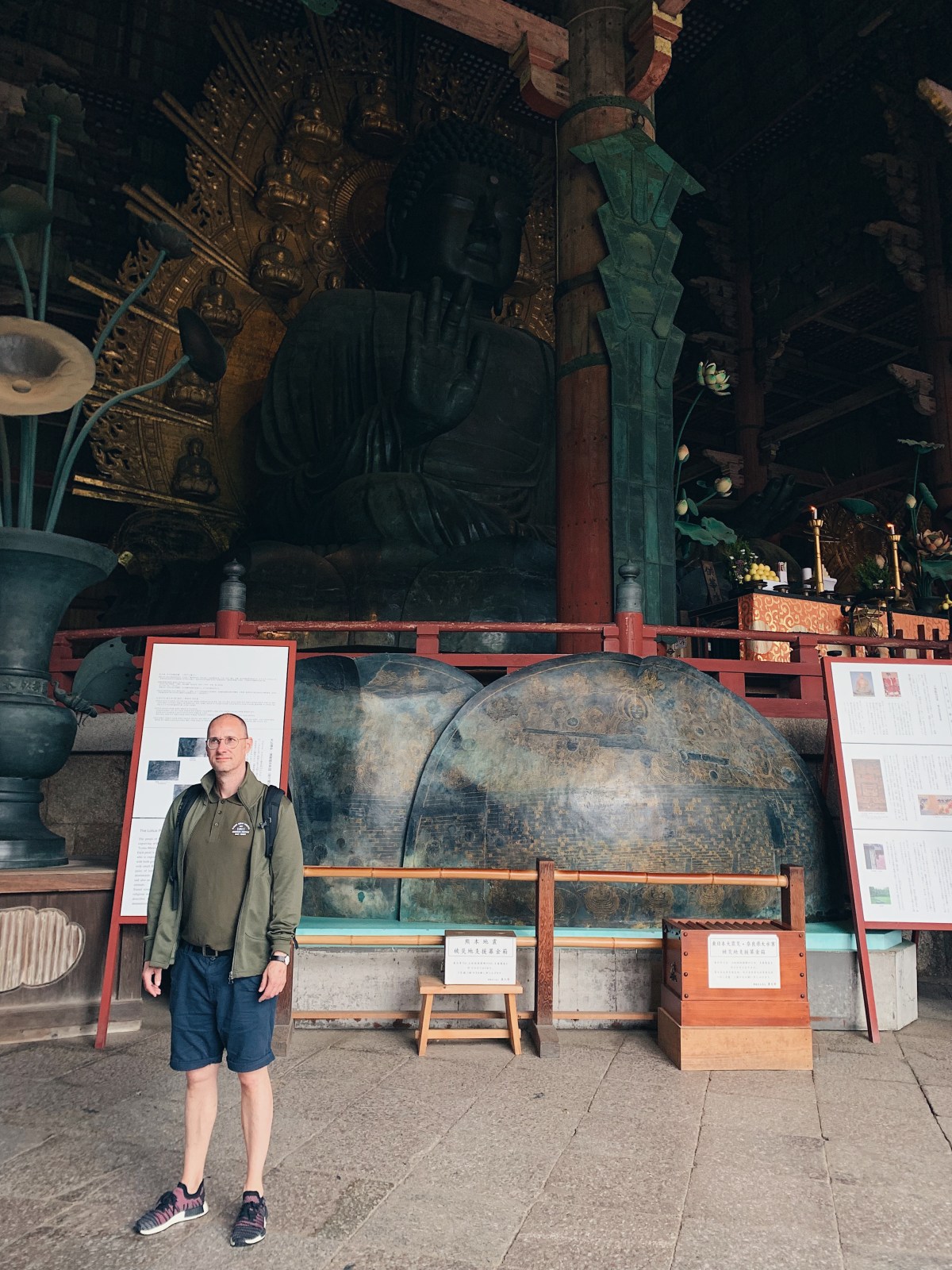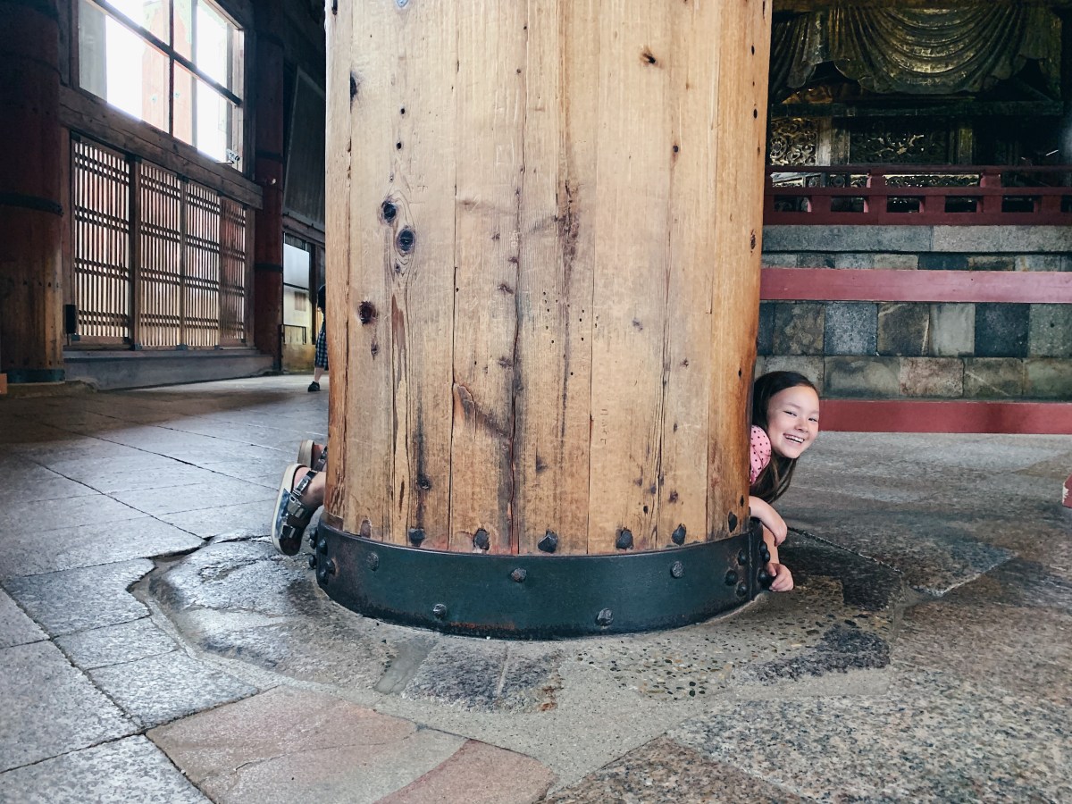 The Todaiji’s main hall, the Big Buddha Hall, holds the record as the world’s largest wooden building, despite the fact that the present reconstruction of 1692 is only two thirds of the original temple hall’s size. The temple building houses one of Japan’s largest bronze statues of Buddha (15 meters tall). Another popular attraction is a pillar with a hole in its base that is the same size as the Buddhas’s nostril behind the statue. It is said that those who can squeeze through this opening will be granted enlightenment in their next life. We of course had to try, however the whole is no larger than it just could fit for Agnes and Dagmar.