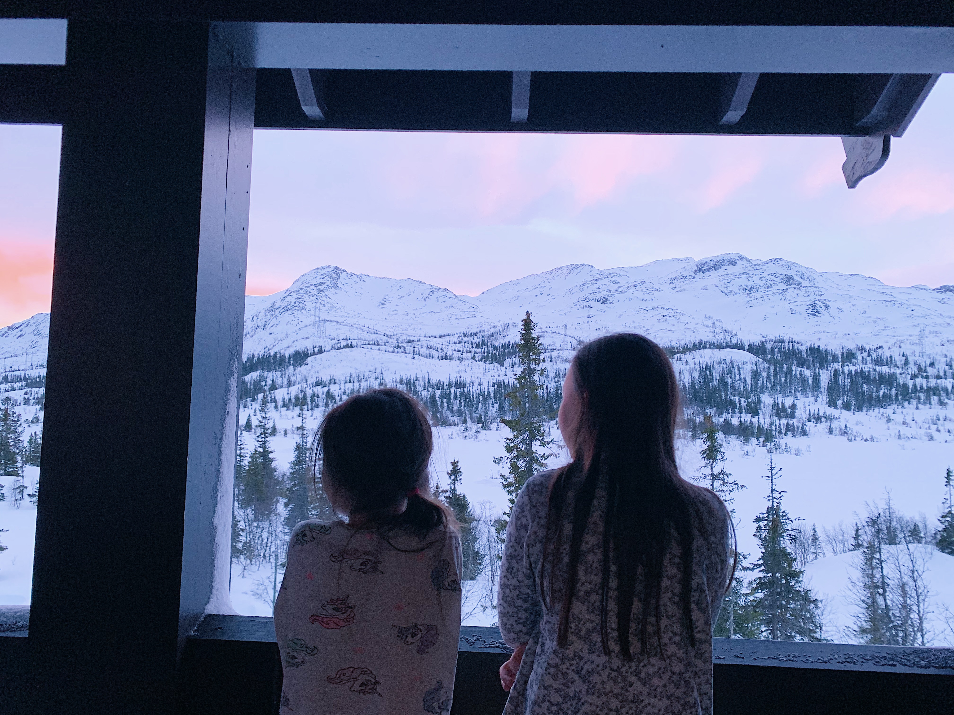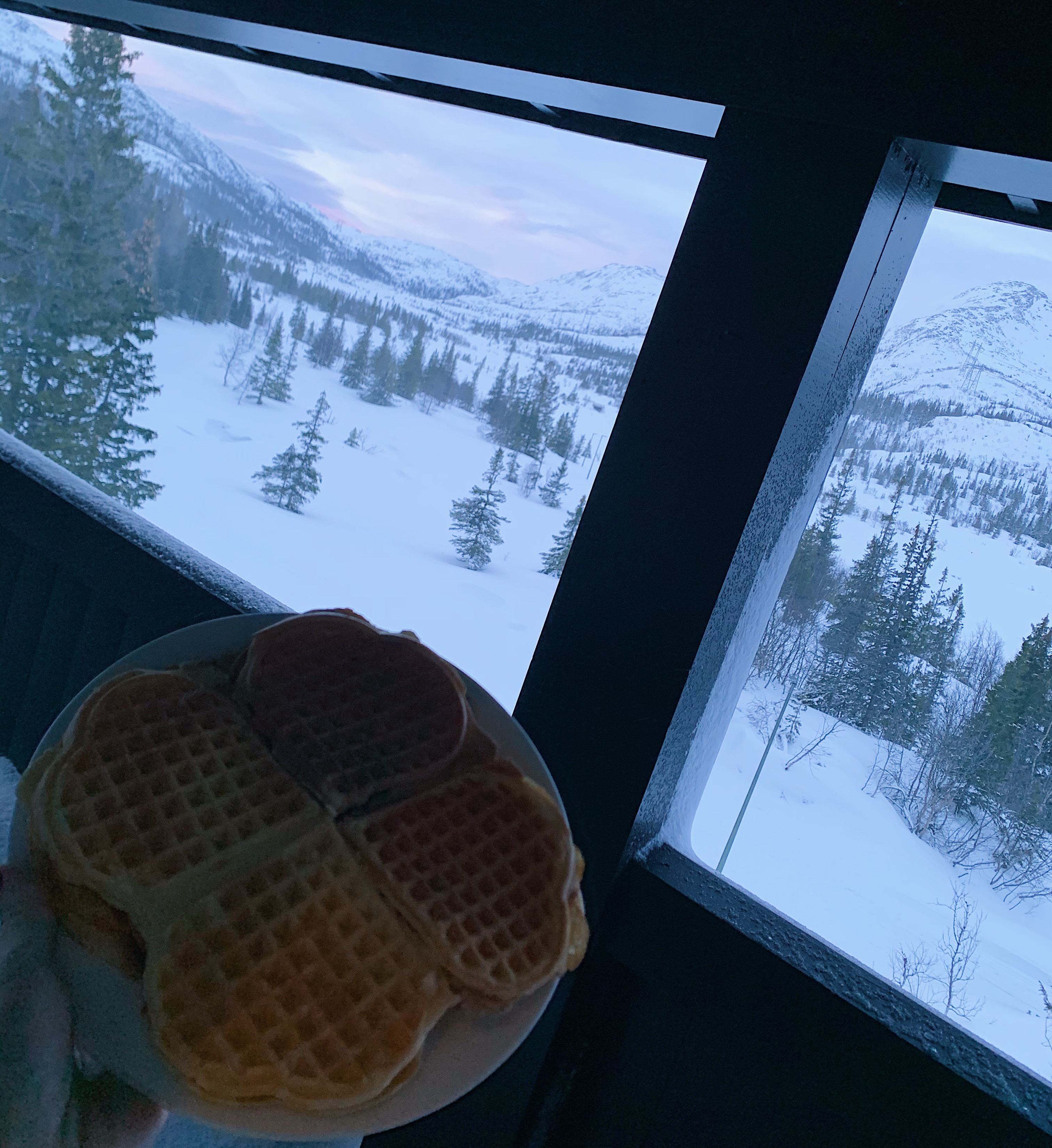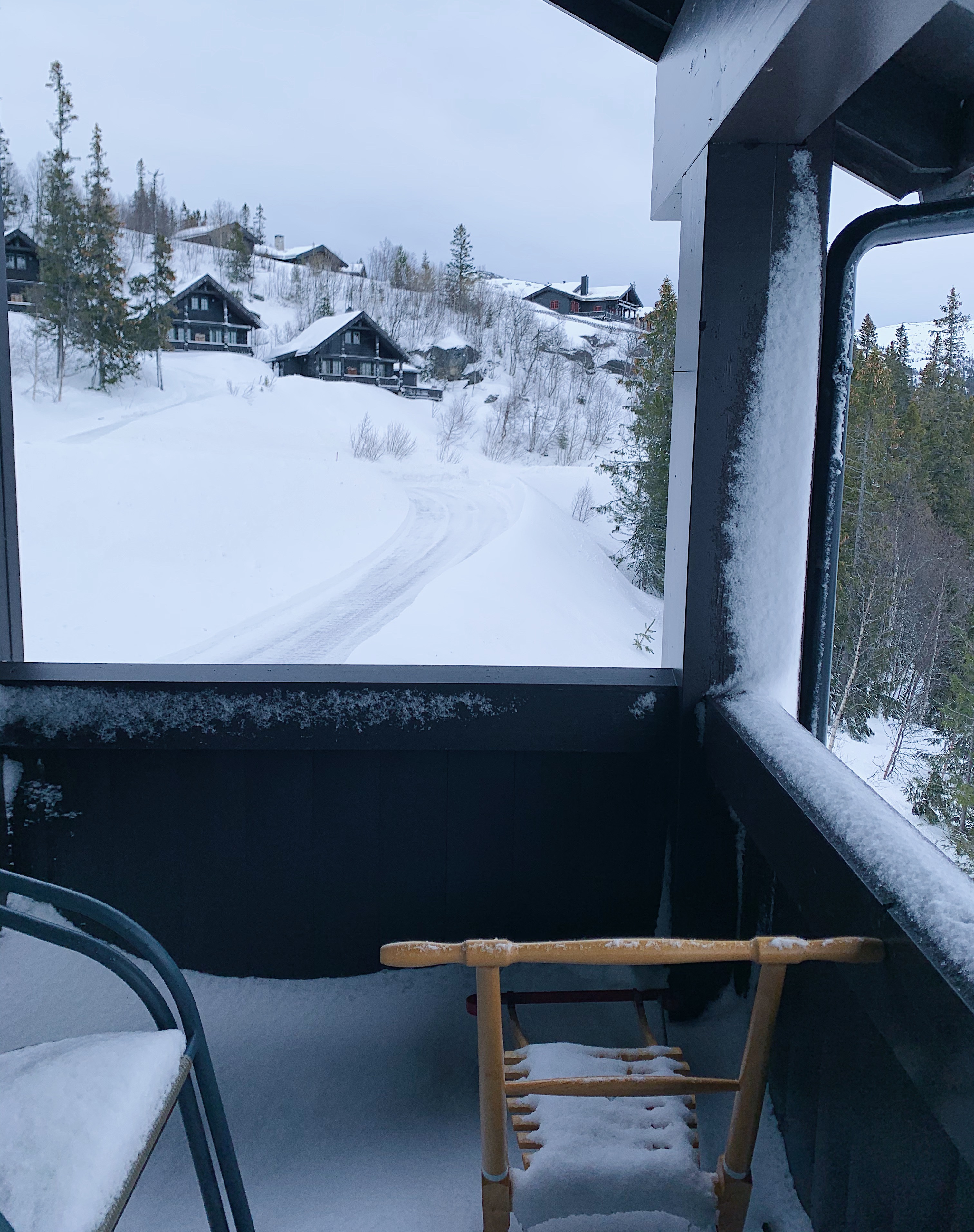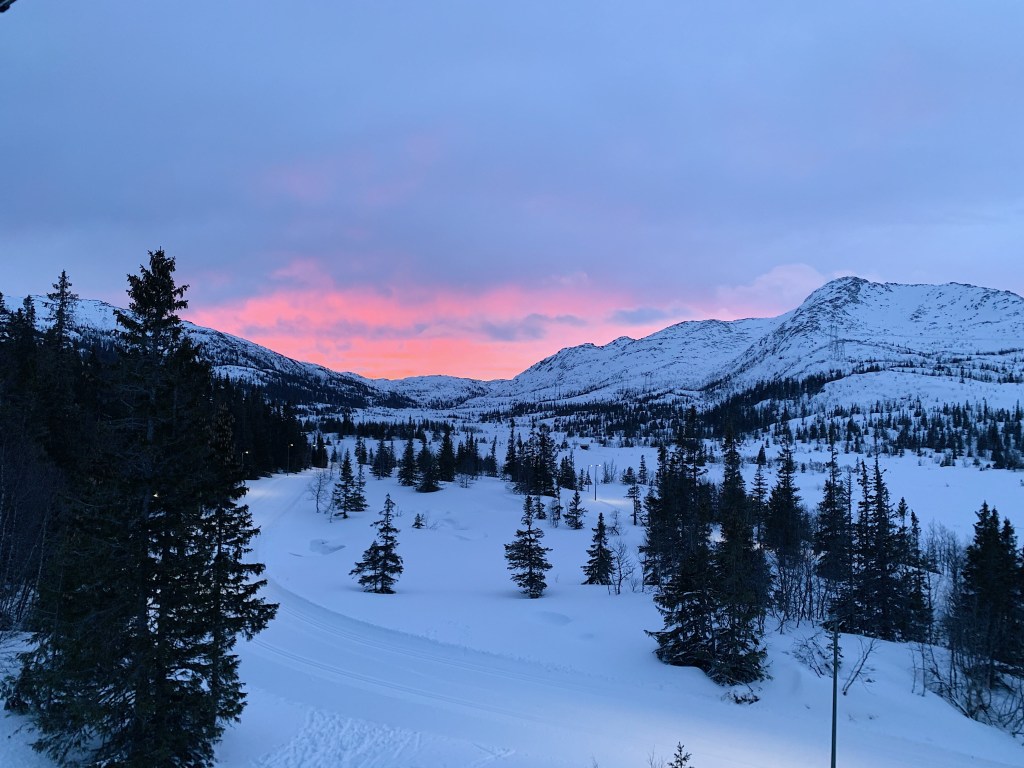 It took 10 hours to drive from Copenhagen to Gaustablikk, so it was almost dark when we arrived. So very exciting to drive up the mountain, when we started the trip up, there was no snow, but as we came further up full snow and ice appeared and we were very happy to have put on our snow chains on the car wheels.