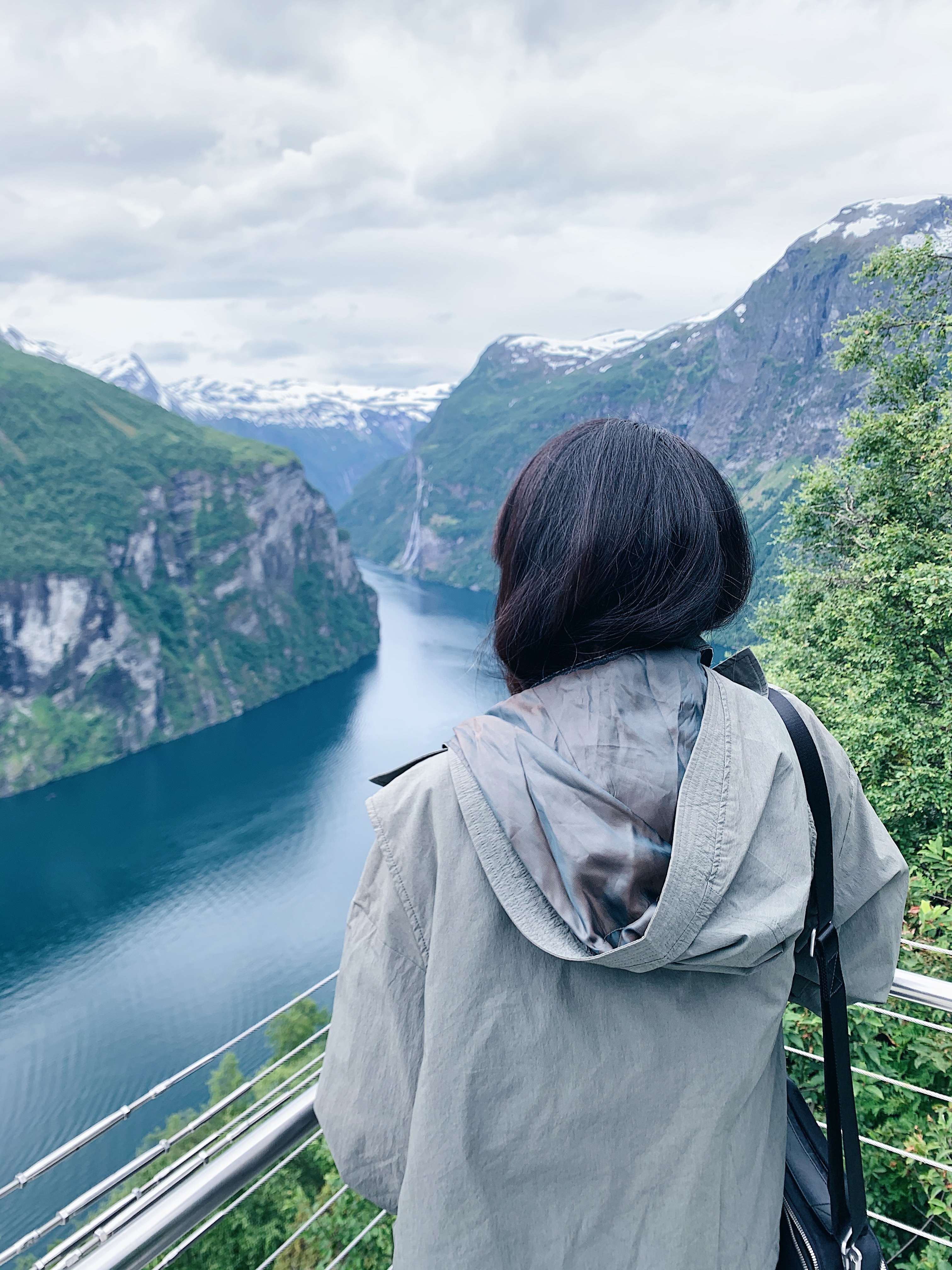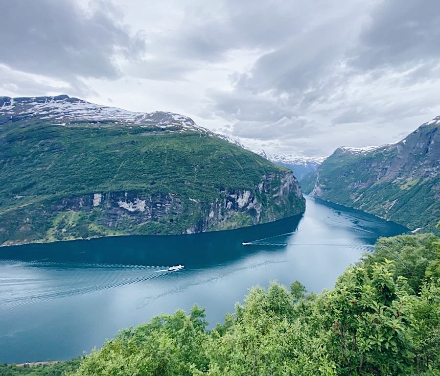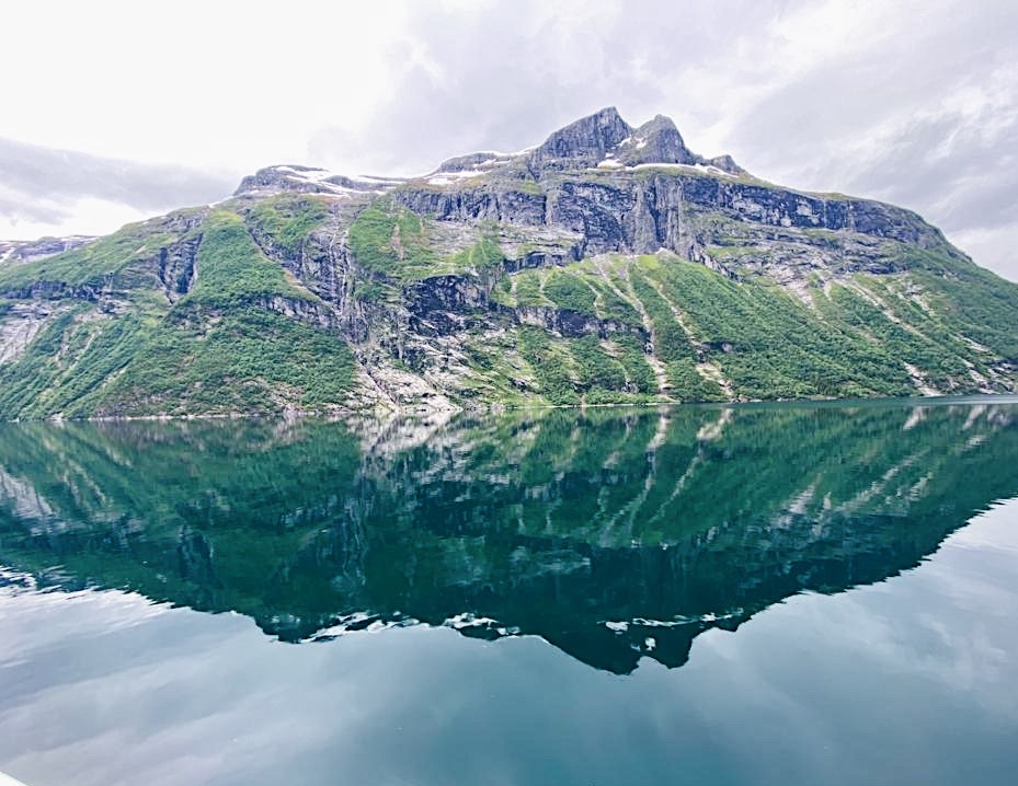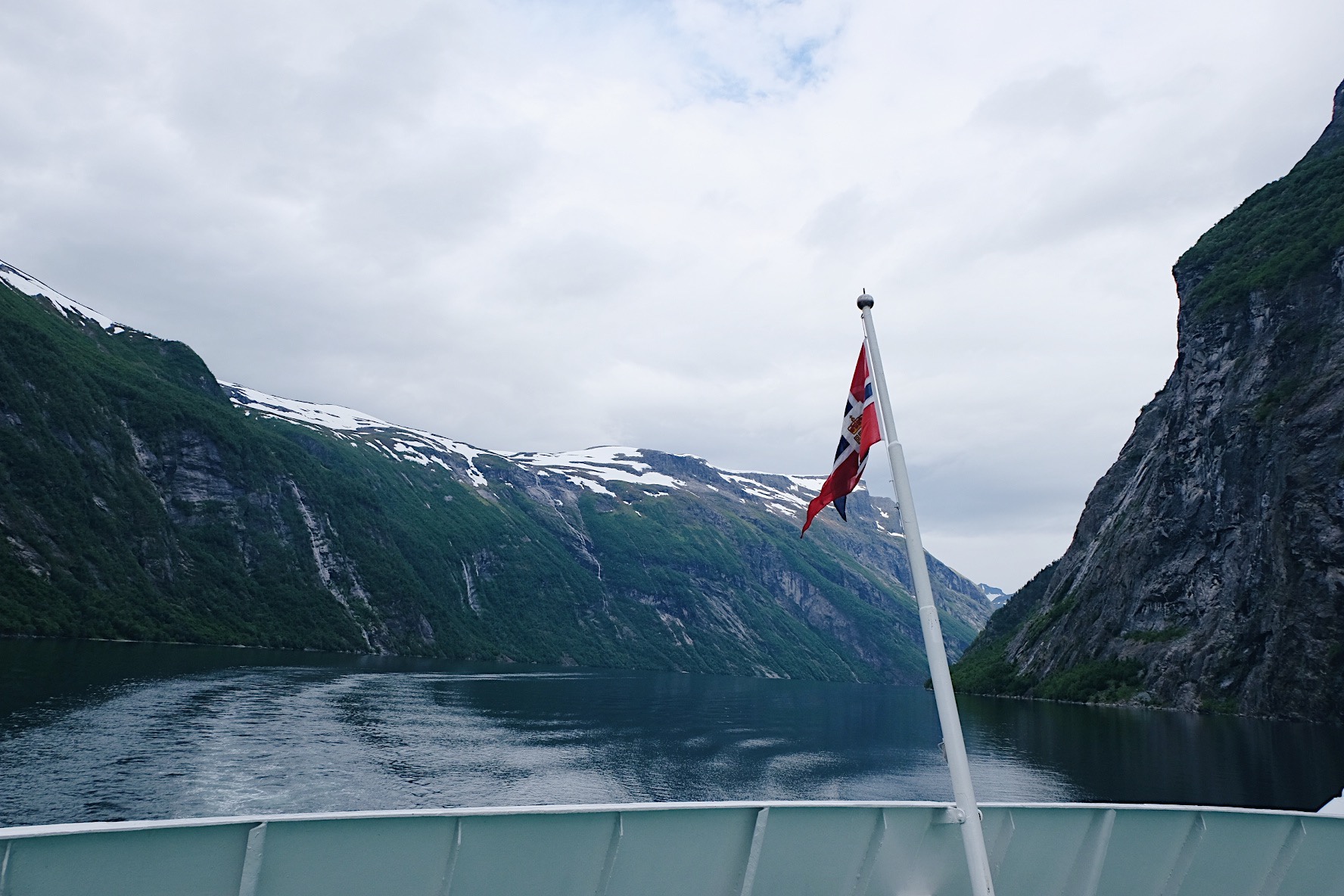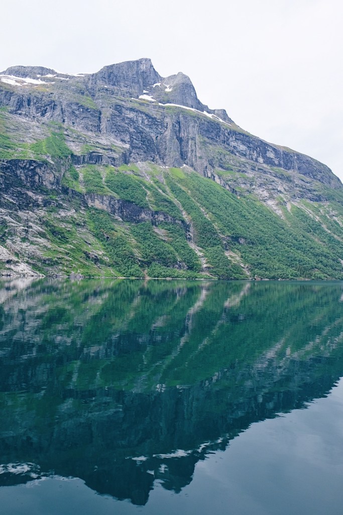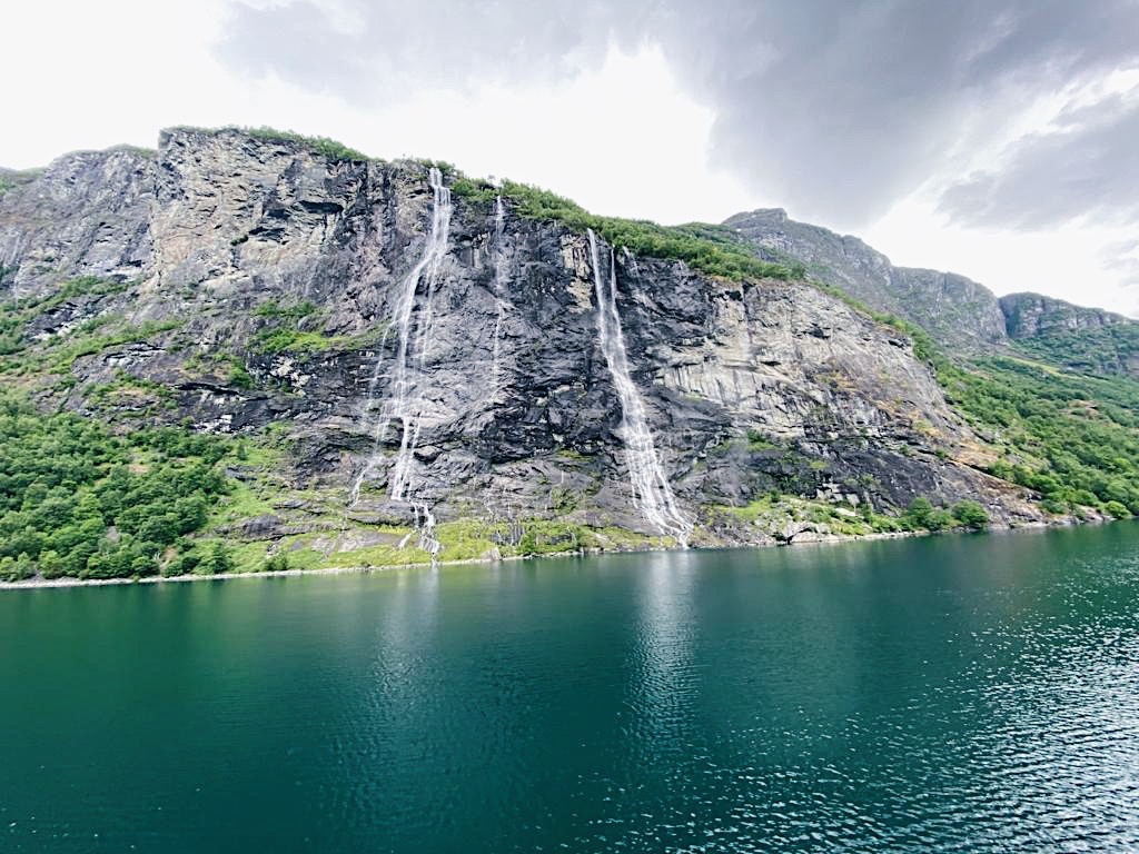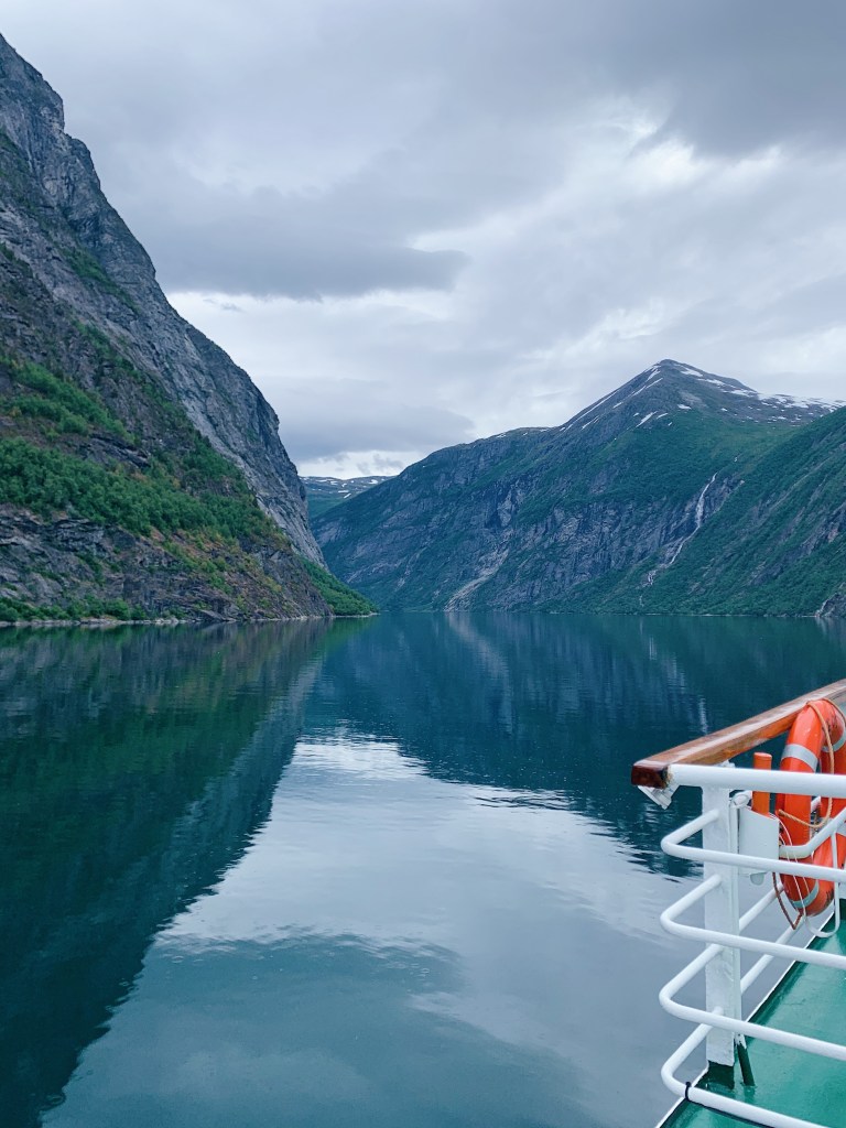 The Geiranger fjord is deep dark green and surrounded by amazing waterfalls and luscious greenery. The fjord is on the UNESCO world heritage list and is also certified as a sustainable destination (working on turning the negative pollution from tourist and such whilst keeping the local nature and culture in balance).