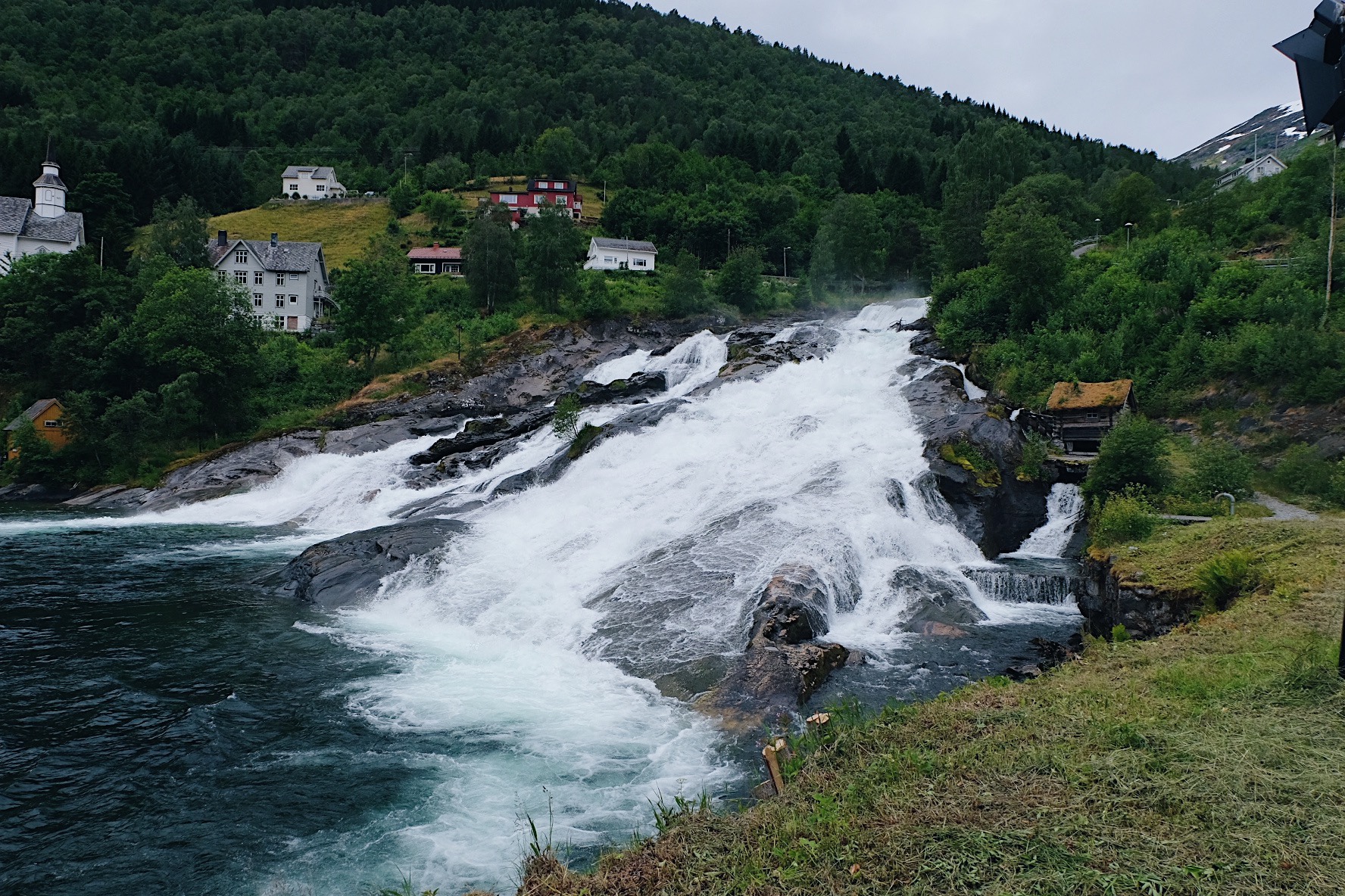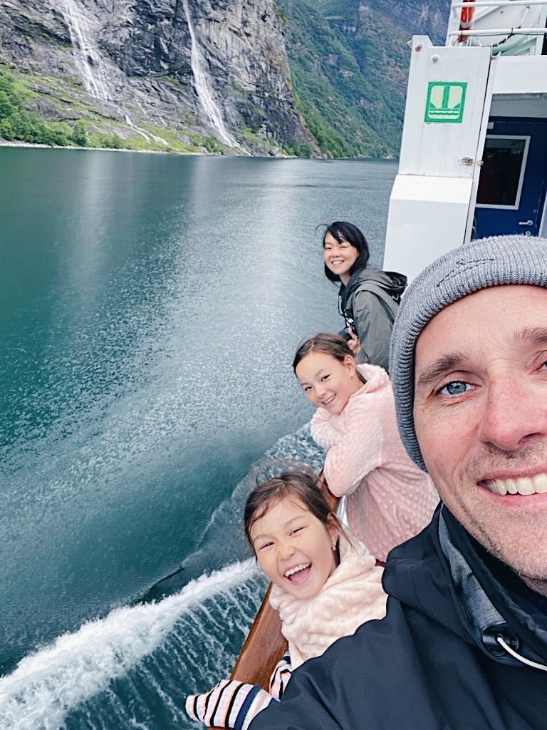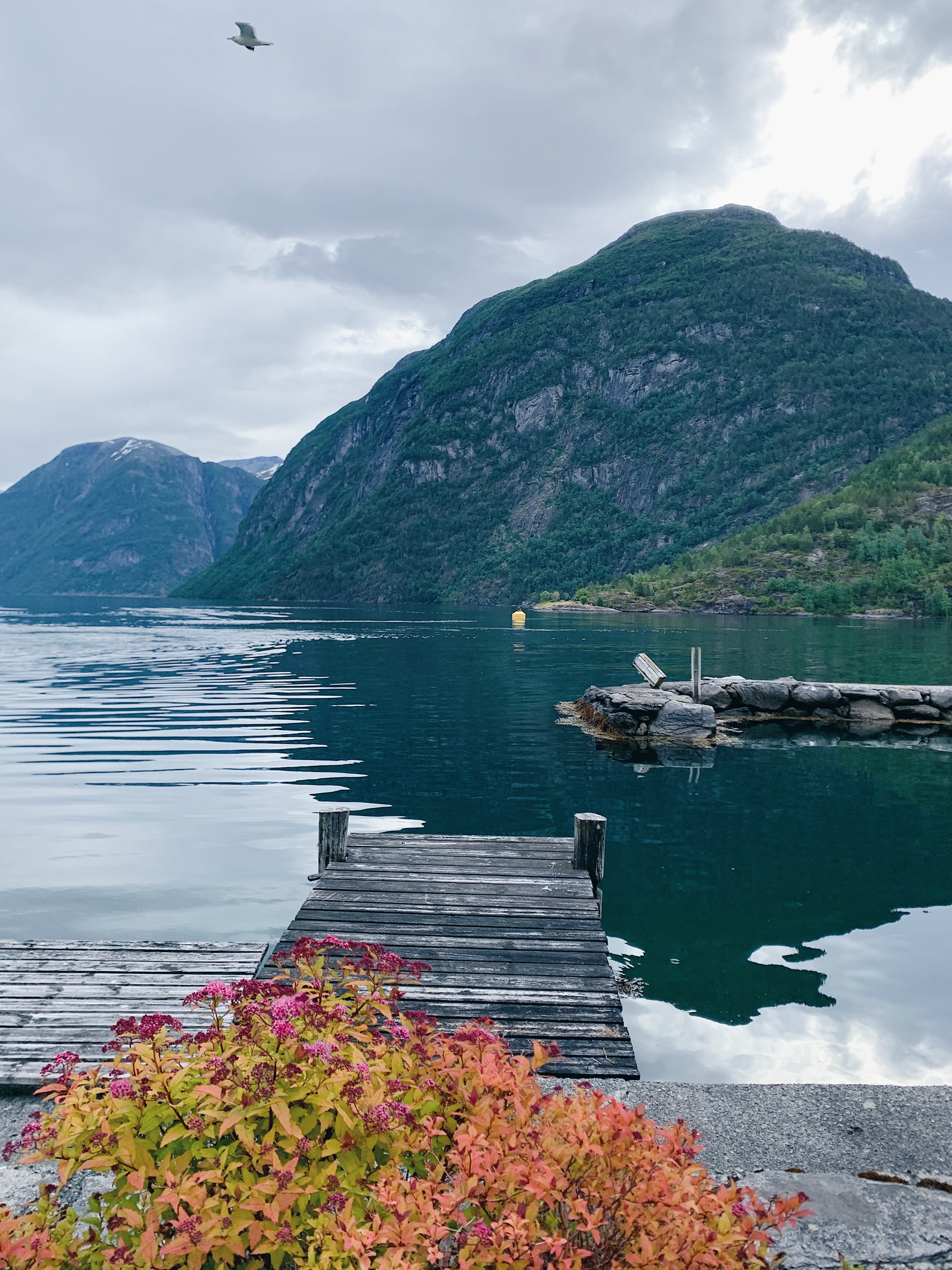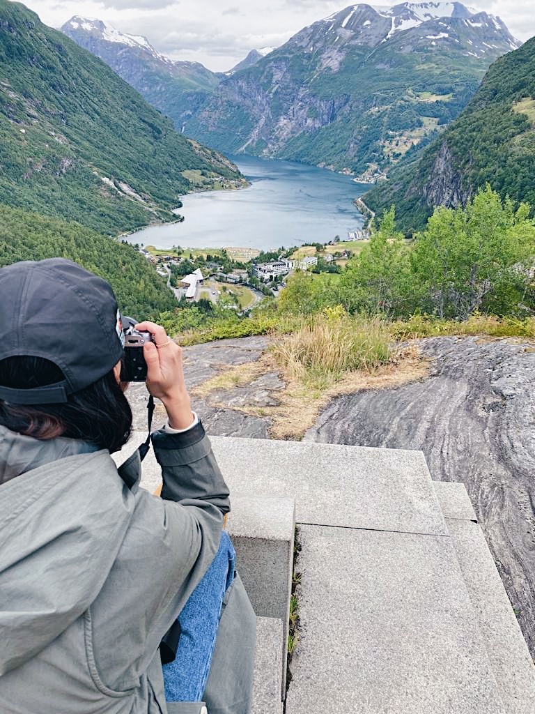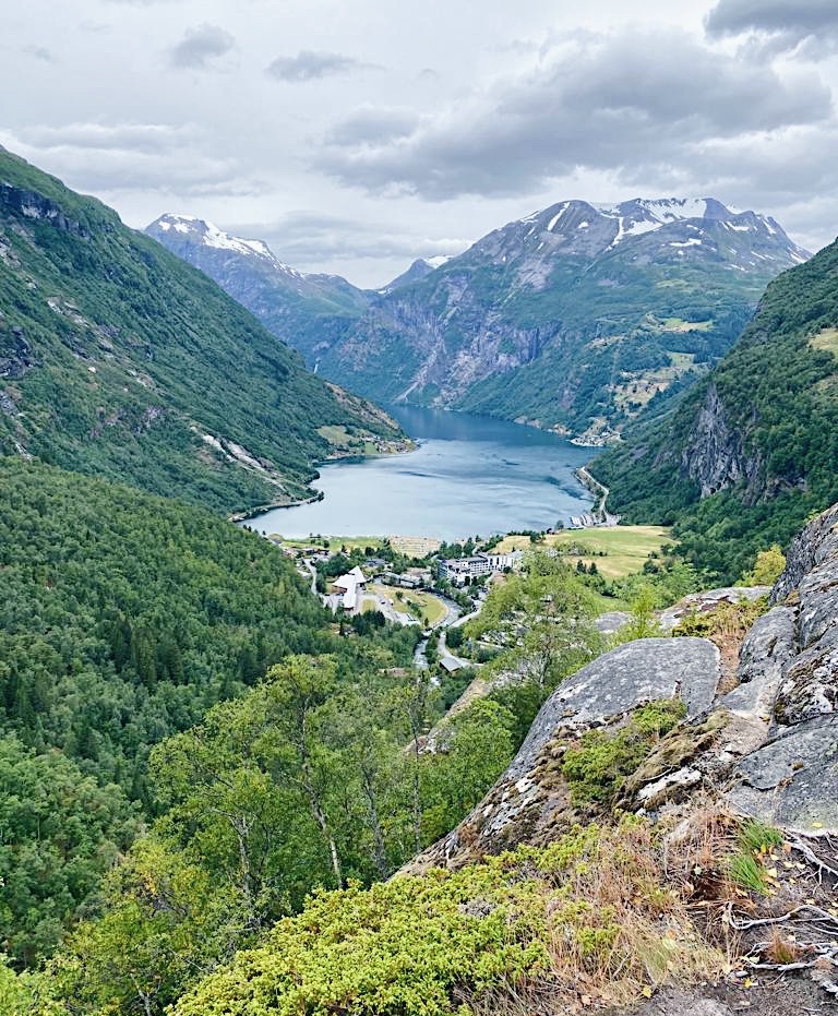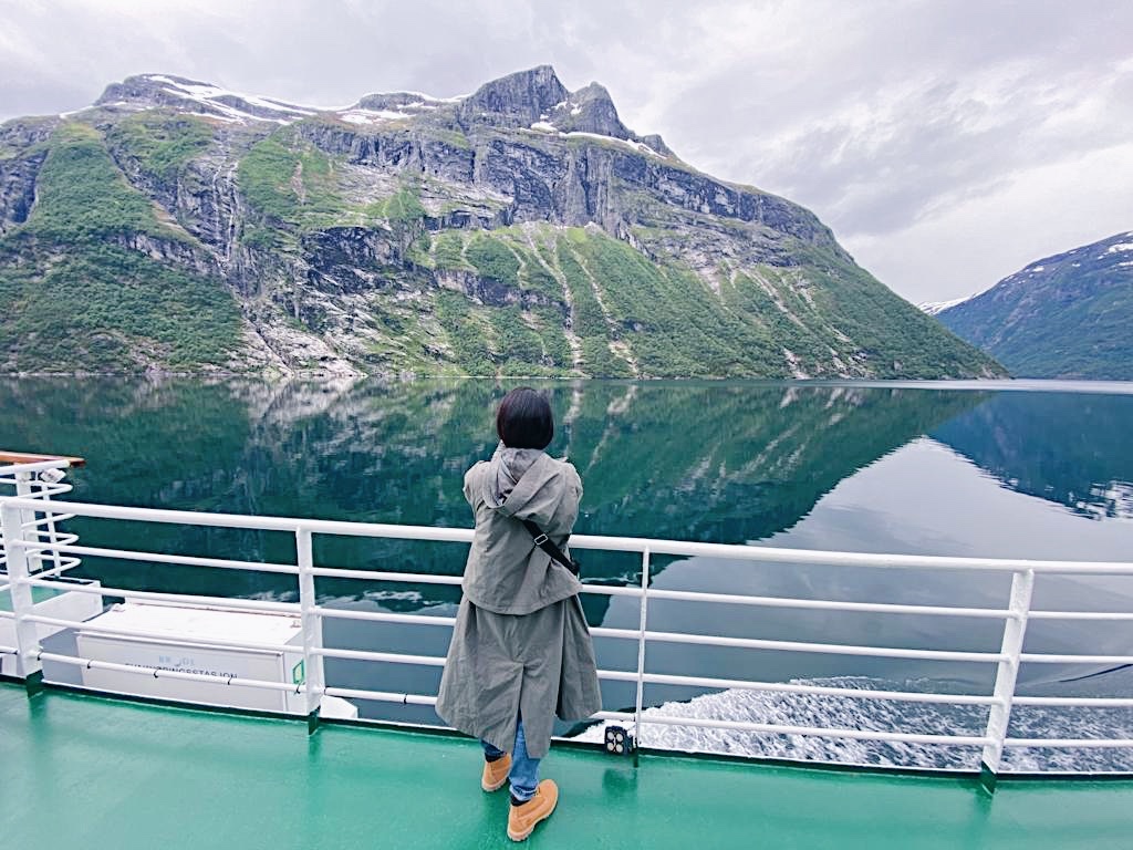 The Geiranger fjord is deep dark green and surrounded by amazing waterfalls and luscious greenery. The fjord is on the UNESCO world heritage list and is also certified as a sustainable destination (working on turning the negative pollution from tourist and such whilst keeping the local nature and culture in balance).