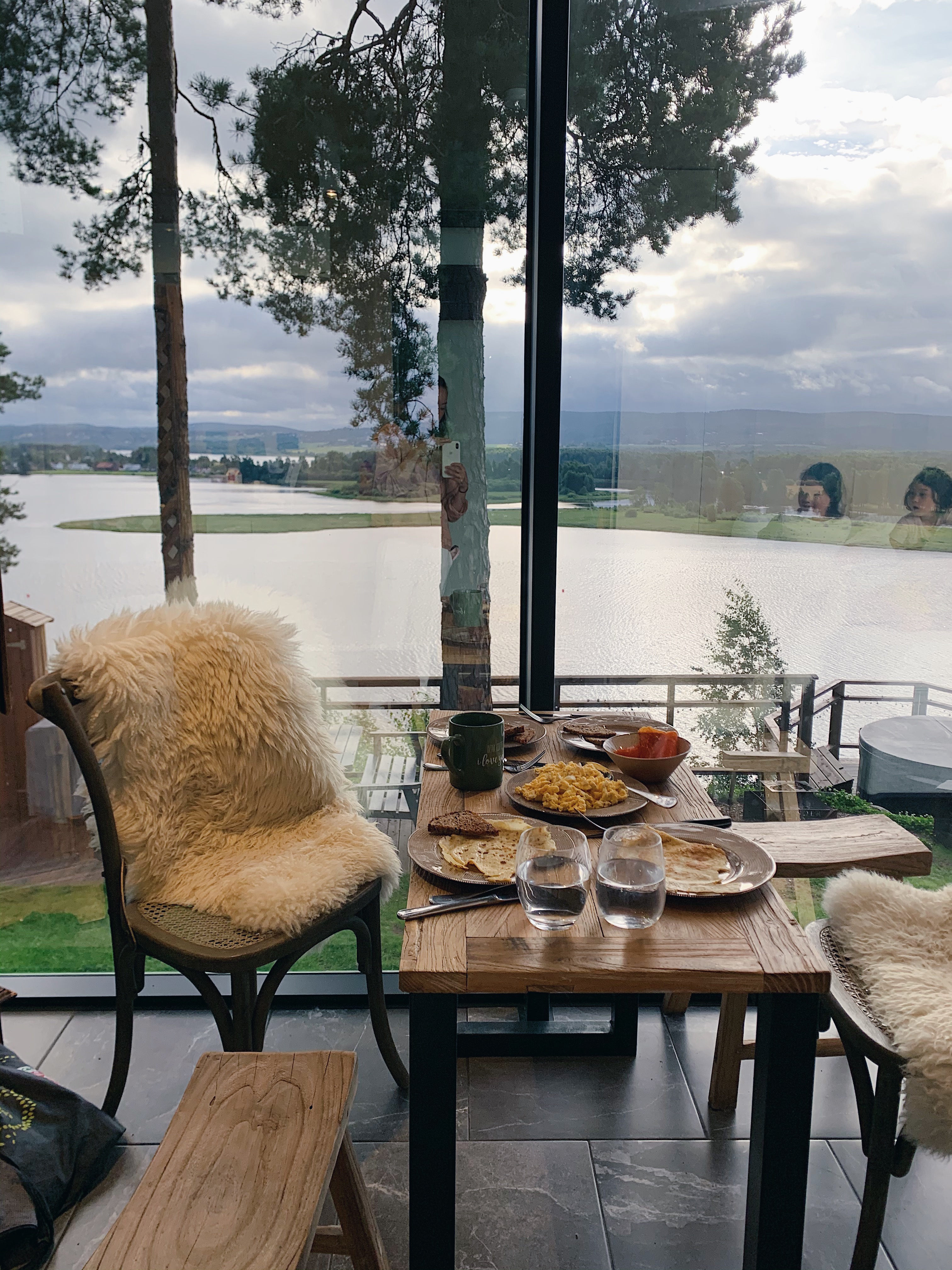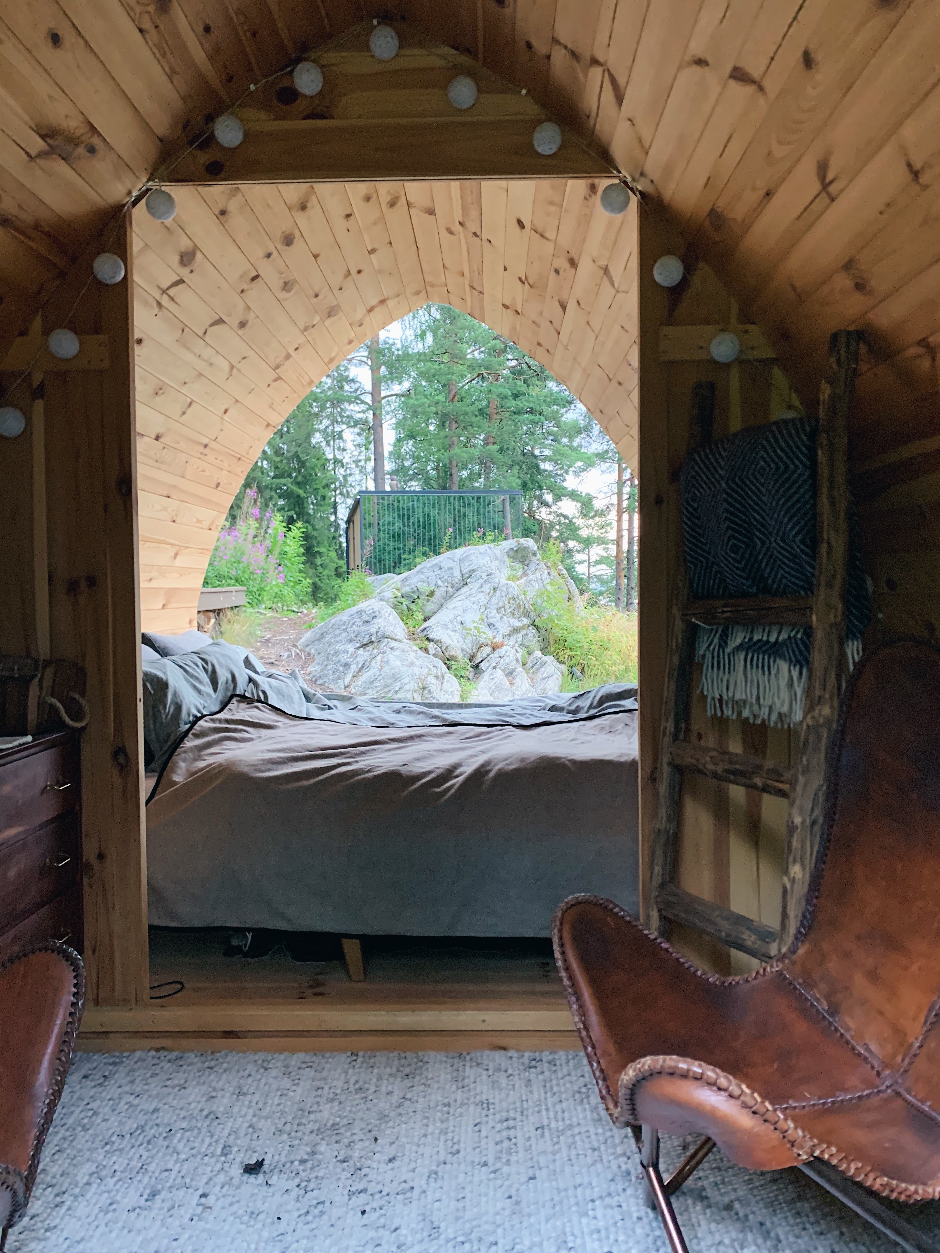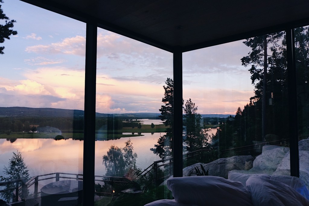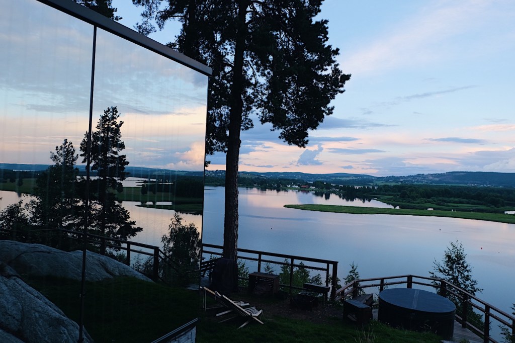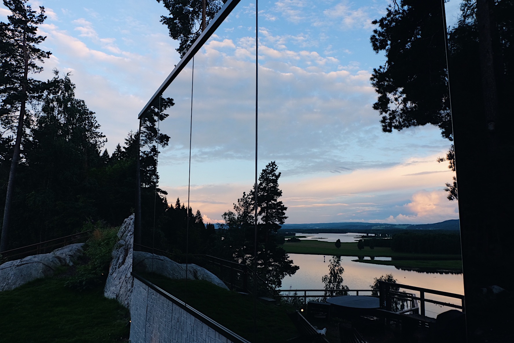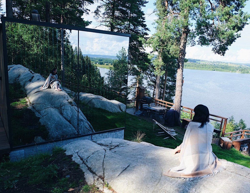 The cabin has mirror all the way around and blends completely in with nature. Inside the cabin you can freely look outside and it like being in the nature in a very comfortable way.