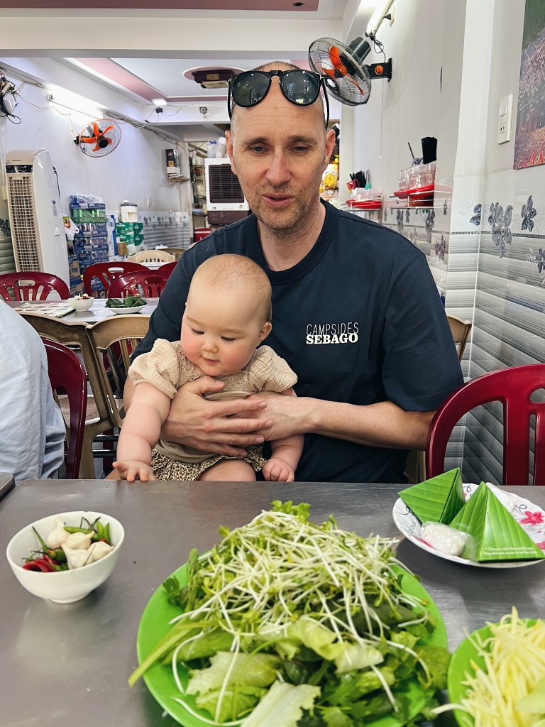 We also went to see the oldest pagoda in the area outside of the city, where young munks live (orphans) and we ended the day with a visit to a local restaurant that served Ban Xeo. Ban Xeo – Vietnamese pancake – is a savory and cripsy dish, where you role a trin omelet with either squid, shrimps or beef together with Bean sprouts, cucumber, mango, salat inside a wet rice paper roll. It is one of the our favourite things to eat in Vietnam and the ones they make in Quy Nhon are just so delicious. Ban Xeo is made in other variations as well, but Quy Nhon claims to have the original version.