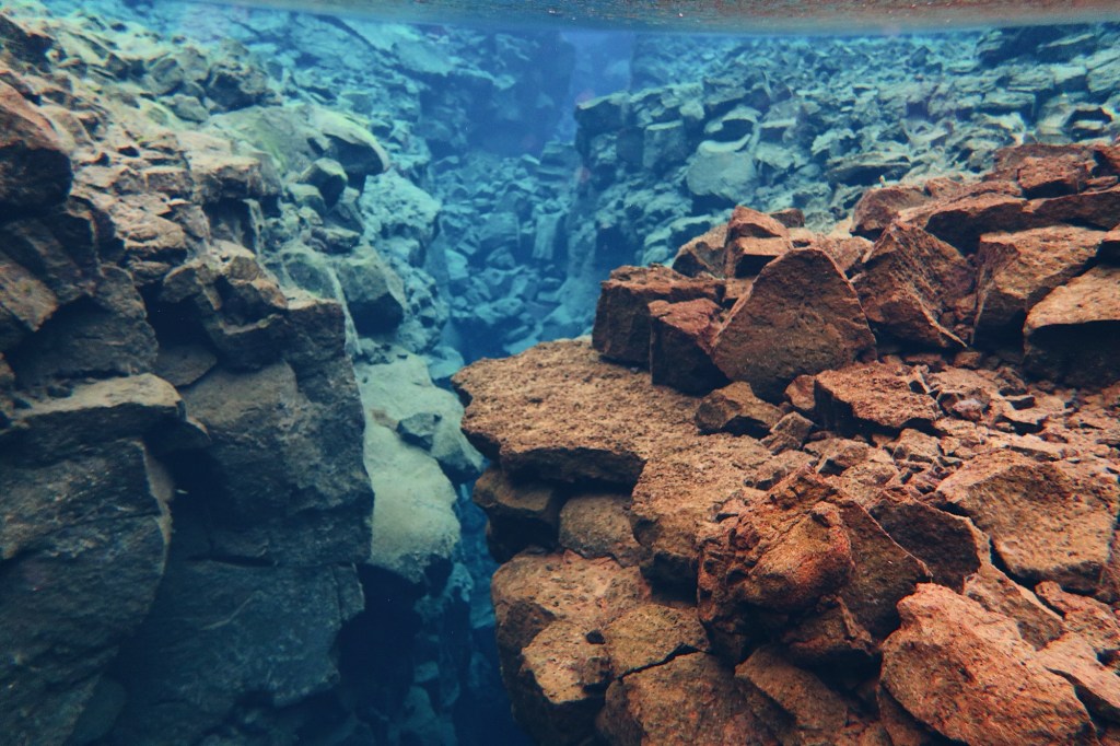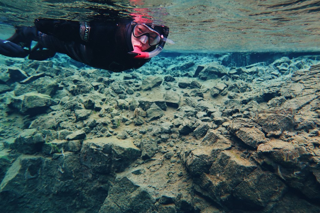 Silfra is actually a fissure created by the separation of the North American and Eurasian tectonic plates cutting through Iceland. The Silfra fissure fills with glacial water that has been filtered underground for decades through hardened, porous lava rock. The filtering process of the glacial water makes Silfra one of the clearest bodies of water on earth with up to 120 meters of visibility. How crazy is that?